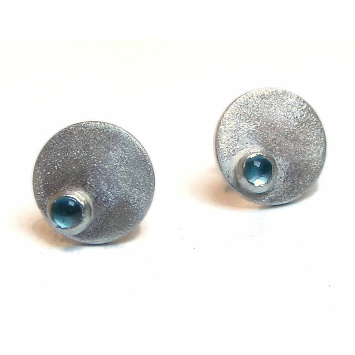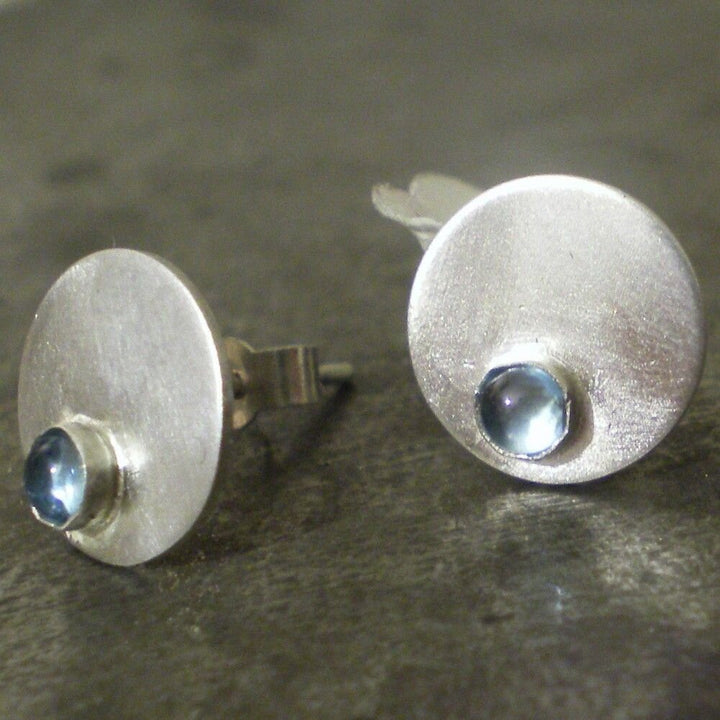Simple elegance to adorn yourself with every day. Each silver disc has a matte brushed finish and features a beautiful bezel set blue topaz cabochon gemstone.