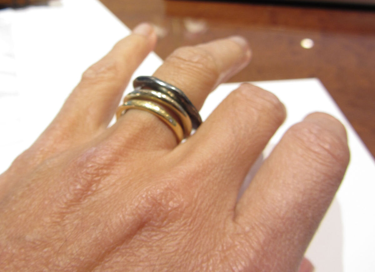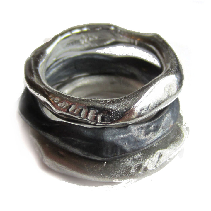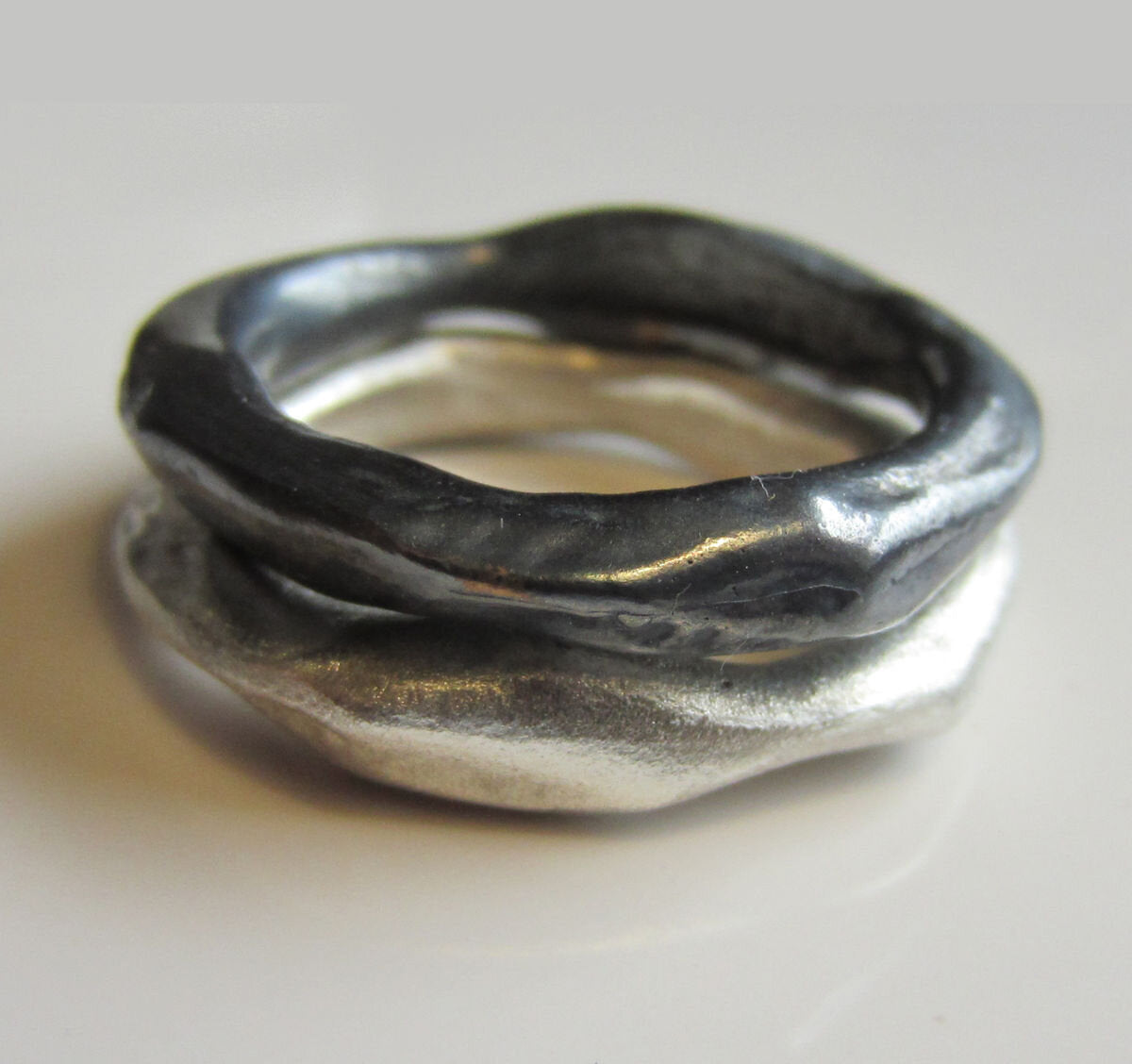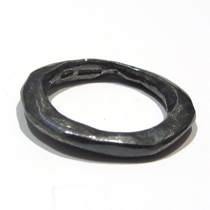 A sterling silver organic ring with oxidised black patina finish. It can be worn by itself or as a stacking ring.