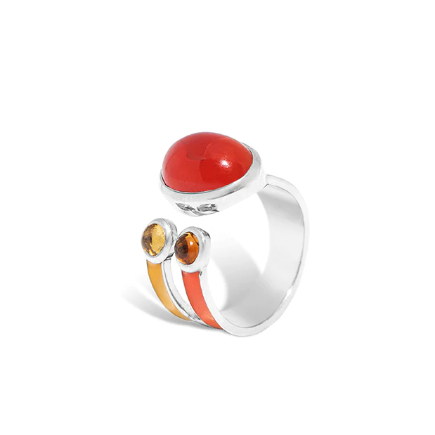 When looking into the history of the stripes, we can conclude that this has been a controversial, but also an incredibly popular pattern for men and women. So many artists, musicians, movie stars and others were seen wearing striped clothing. We are all in love with stripes, so why not wearing striped jewellery too? The Yellow and Orange Striped Ring is in polished sterling silver and enamel, set with yellow and orange tourmaline stones and orange jasper. Jasper is a strong securing and emotionally calming gemstone that helps in relieving stress.