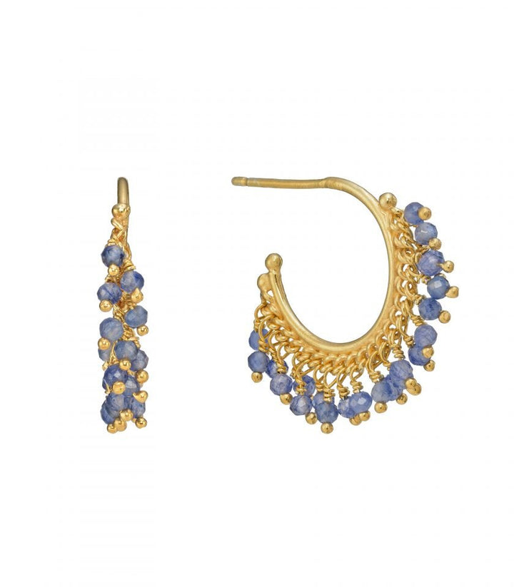 Beaded hoop earrings with a twist! These gorgeous little hoops are beaded with cornflower blue sapphires in a sparkly round cut, set in yellow gold vermeil. With curb chain and granule detail, these hoop earrings have an intricate look reminiscent of traditional Indian jewellery. In a small wearable size with an easy stud fitting, these pretty little beaded earrings are a great addition to your hoop earring collection.