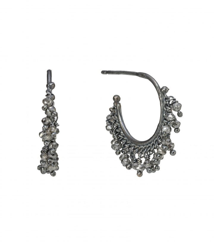 Oxidised sterling silver with salt and pepper diamonds.Dimensions: Inner diameter 1.4cm. Approx. size of beads 1.5-2mm.