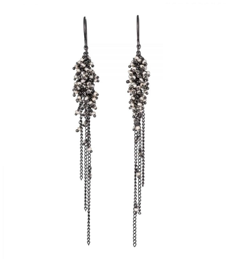 Oxidised sterling silver with freshwater pearls.Dimensions: 8cm drop length x 1cm width. Approx. size of beads 1.5-2mm.
