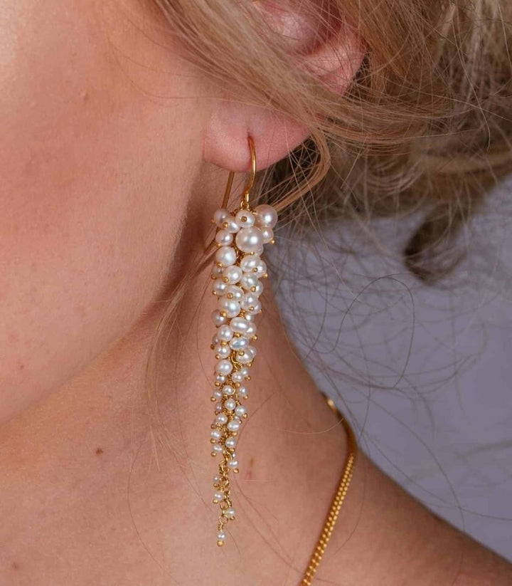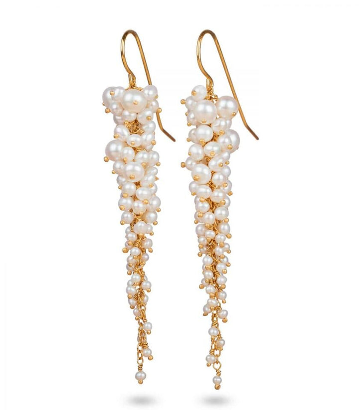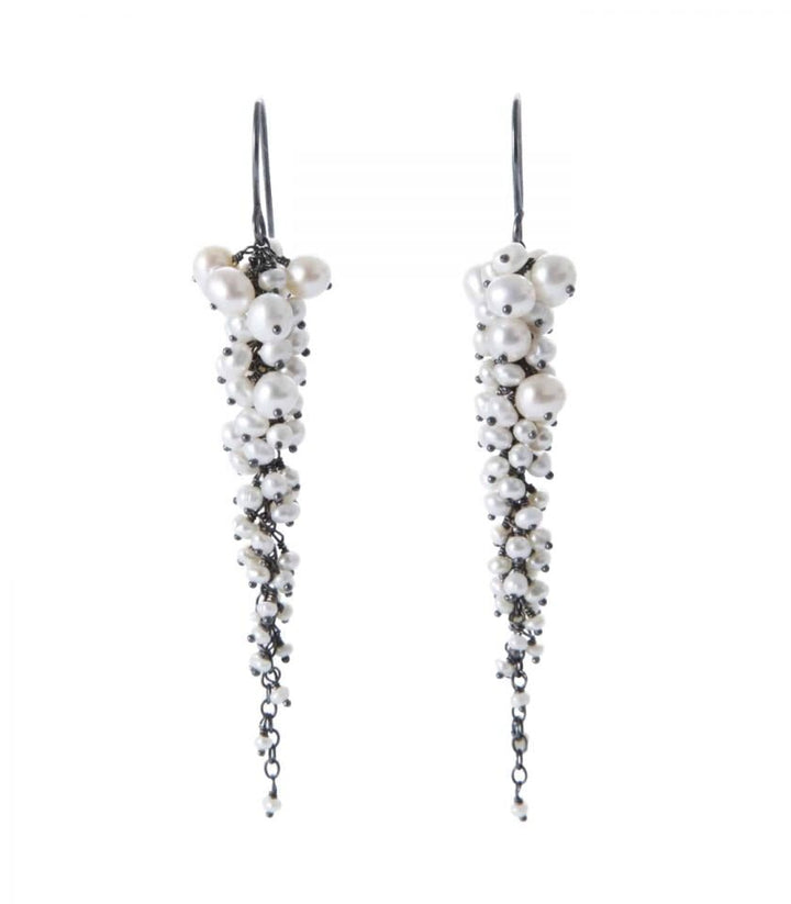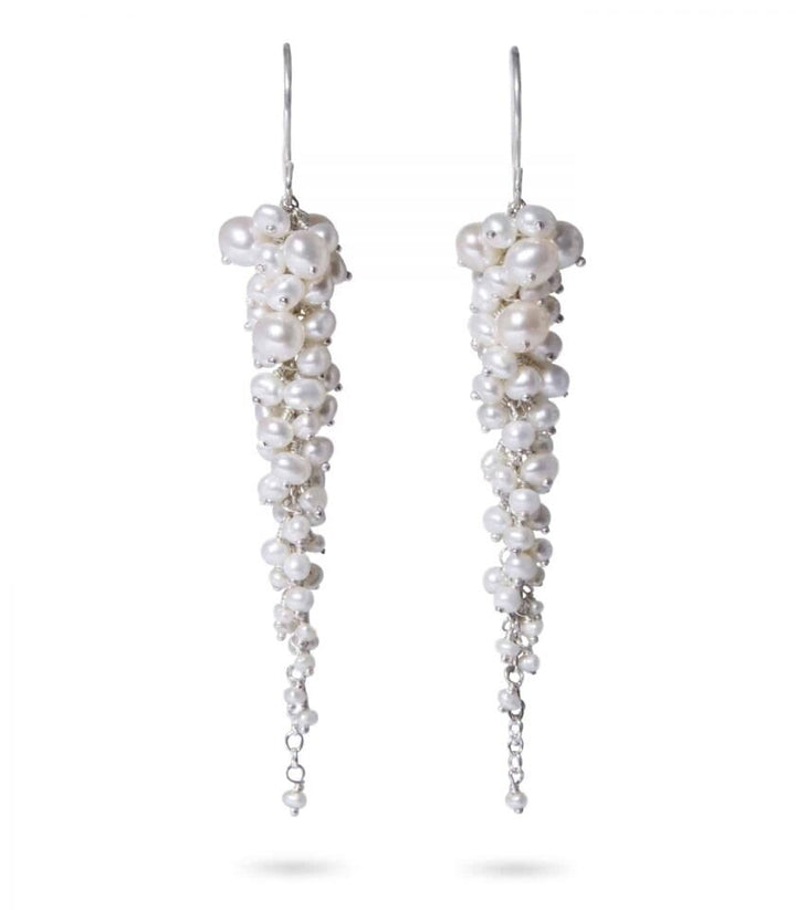 A beautifully tapered, slender cluster of lustrous ivory freshwater pearls. Each pearl is meticulously wire wrapped by hand onto delicate trace chain with a hand-made pin. A long-standing favourite with brides and with anyone wanting a special and very feminine pair of earrings. Pearls are the birthstone for June and the traditional 30th wedding anniversary gift.