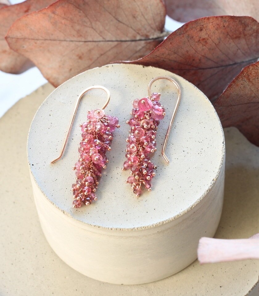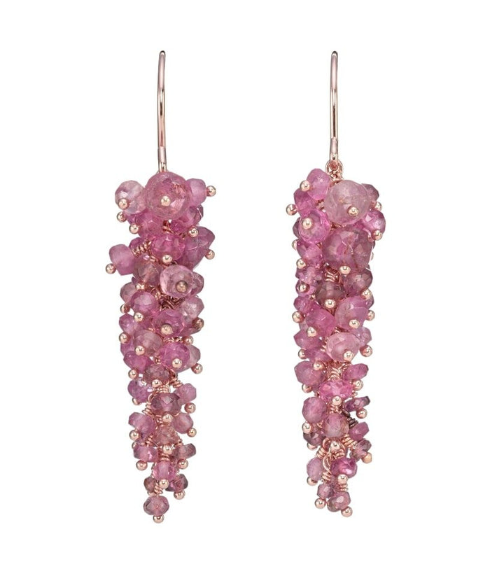 Pink tourmaline drop earrings. A beautifully tapered cluster of faceted pink tourmaline beads with a graceful shape inspired by wisteria blossom. The natural stones show a range of beautiful colours from soft rose to deep pink. Pictured in rose gold vermeil, these elegant earrings are also available in yellow gold vermeil. Each bead is meticulously wire wrapped by hand onto delicate trace chain with a hand-made pin. A classic, versatile and very feminine pair of earrings. Tourmalines (along with opals) are the birthstone for October.