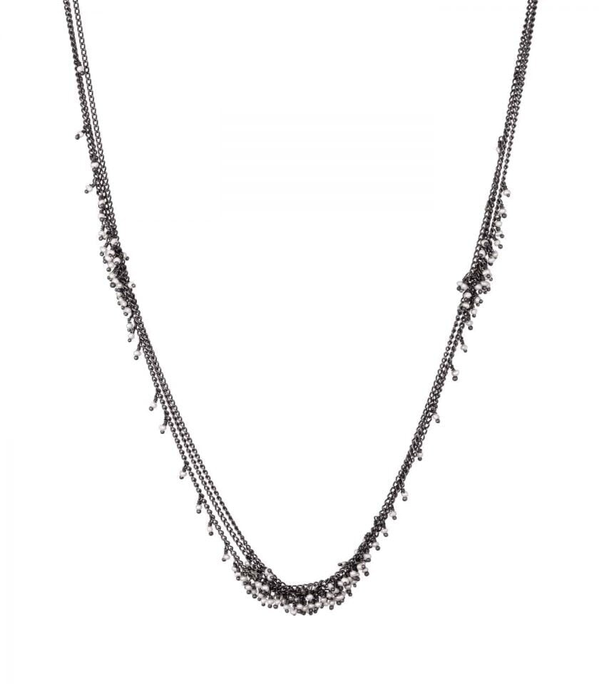 A delicate seed pearl cluster necklace. Three clusters of the tiniest pearls are pinned to three extra fine curb chains in this monochrome necklace. The dainty seed pearls create an intriguing natural texture in combination with the fine chains. Feather light and easy to dress up or down.