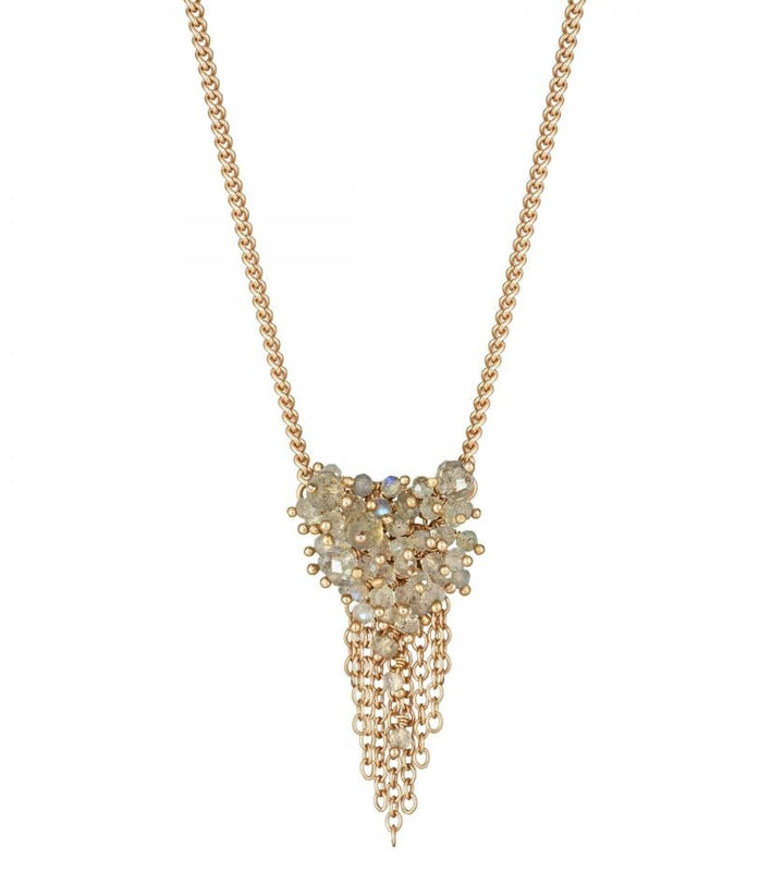 A dainty little pendant with luminescent labradorite beaded onto rose gold-plated silver chain. A chevron of fine chains is encrusted with labradorite stones to create an ethereal and easy to wear pendant necklace. The varied sizes of the stones create a beautiful organic texture.
