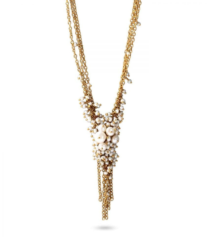 A delicate hand-beaded pearl necklace of intricately woven fine gold plated silver chain. A beautiful cluster of freshwater pearls, in graduated sizes for a unique, organic texture, are woven into a tapering 'V' shaped tassel. Sitting flatteringly just below the hollow at the base of the throat, the necklace can be adjusted slightly longer, to wear over a higher-necked top.