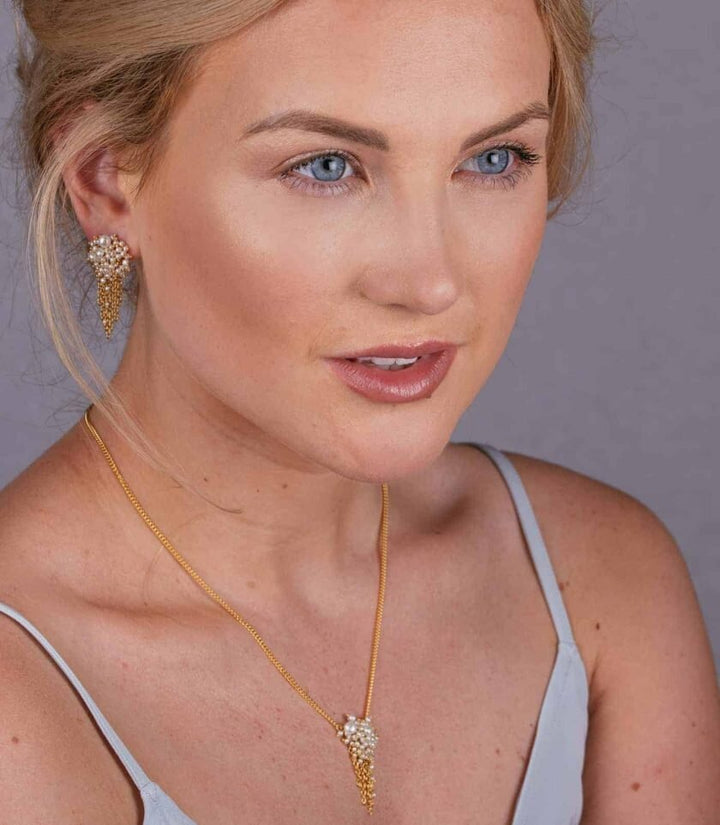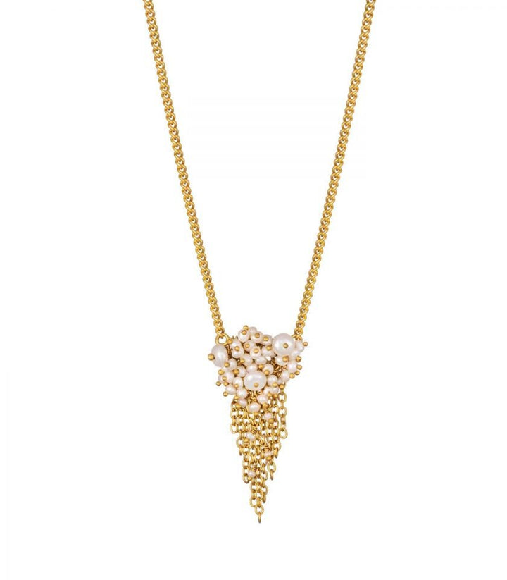 A dainty little pendant with the tiniest of seed pearls beaded onto buttery gold-plated silver chain. A chevron of fine chains is encrusted with pearls to create an ethereal and easy to wear pendant necklace. The varied sizes of the pearls create a beautiful organic texture.