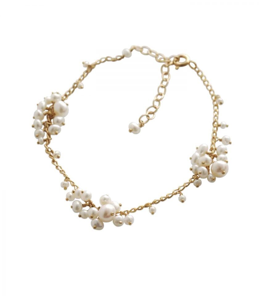 Three clusters of tiny freshwater pearls are scattered along a delicate gold vermeil curb chain on this dainty bracelet. Really wearable for every day, on its own or stacked with other bracelets. Pearls are the birthstone for June.