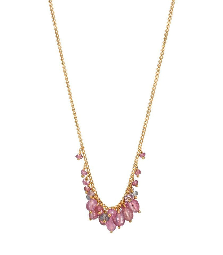 A pretty gemstone cluster necklace on fine curb chain, in shades of pink, peach, lilac and blue spinel. Such a feminine and dainty piece, like a spring blossom. This delicate necklace features gorgeous natural shades of spinel semi-precious stones.  Smooth pebble-like oval beads in pink tones are sprinkled with sparkling faceted rondelles in pinks, peaches, lilacs and blues.