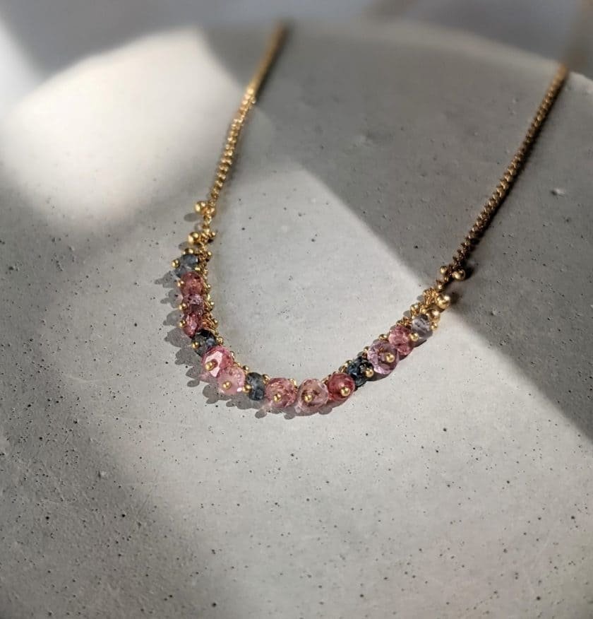 Gold vermeil with lilac, pink and blue spinel.Dimensions: Chain length adjusts from 45cm to 48cm long. Approx. size of beads 2-3 mm.