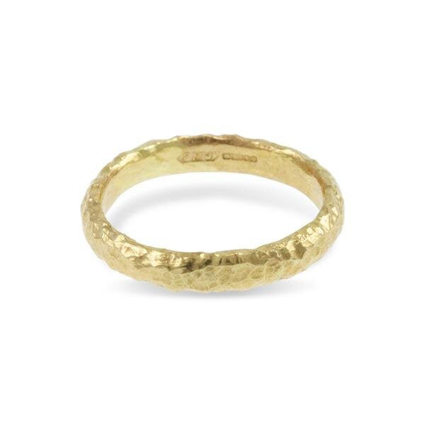 This gold ring is narrow in construction with a D shaped profile and handmade in recycled 9k yellow gold. The bands are made individually so they are all original, no two being the same. They are finished with Paul's signature roughly hewn organic texture.
