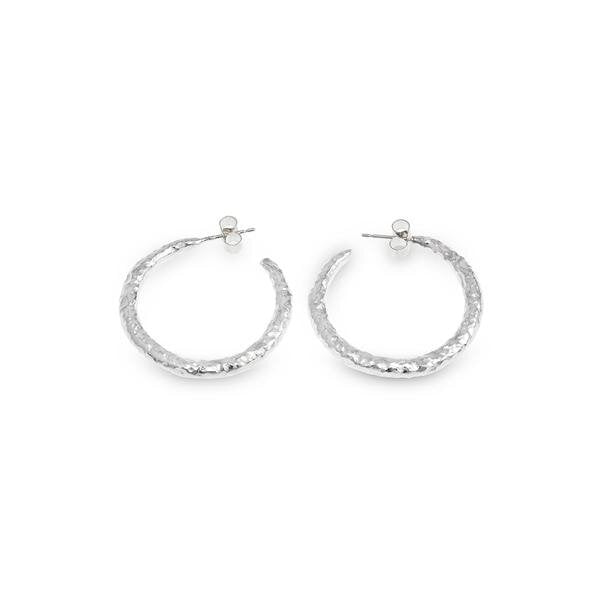 Ensure your jewellery collection has all the essentials with these simple hoop earrings. From the Lucerus collection, their full circular design envelopes the entire earlobe while ensuring detail can be seen from every angle. Each one has been roughly hewn from the finest sterling silver and features Paul Magen's signature organic textured finish. Creating a unique platform for light to produce shadows and highlights, this texture produces a unique accessory for every woman.