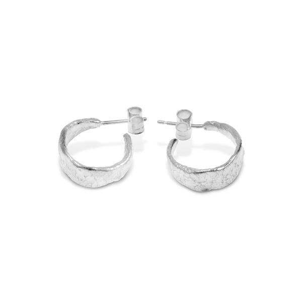 Beautifully understated, these earrings have a sterling silver reticulated band that swirls around the earlobe and fastens securely with a classic post and butterfly fitting. The surface has been textured with an organic finish that plays with the light in a beautifully unique manner. They are the ideal accessory to carry you through from day to night with a natural charm that captures your heart.