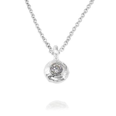 This minimalist yet striking silver pendant forms part of the Duco jewellery range. Sitting flat to the neckline, it has a sterling silver rounded disc with an organic textured surface. Nestled in the centre, a rich white cubic zirconia stone sparkles out with its clear and shimmering cut that is sure to capture every eye. The entire piece is supplied on a comfortable and versatile silver chain that allows it to sit at the ideal position for a wide range of necklines.
