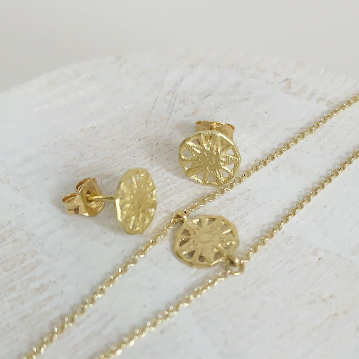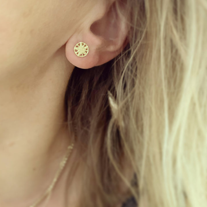 From Claire's Cosmos Harmony collection. Choose shooting stars or lucky stars…sparkling wire star motifs to connect us with the cosmos and remind us we are under the same sky. Textured solid gold star stud earrings.
