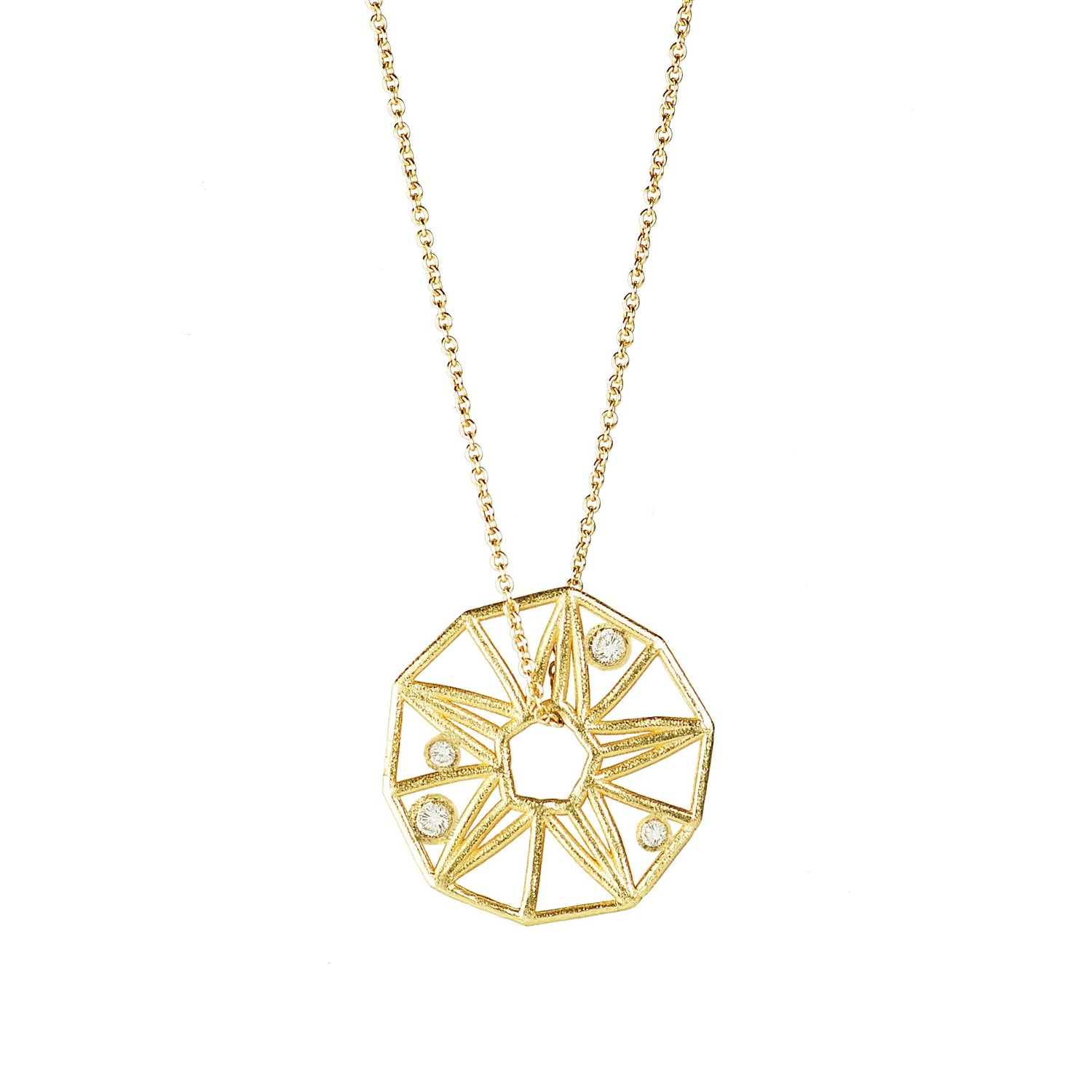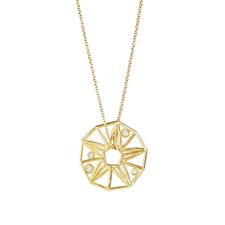 18k recycled gold pendant with diamonds on 18k gold chain.Dimensions: 21mm pendant on 18 inches chain.