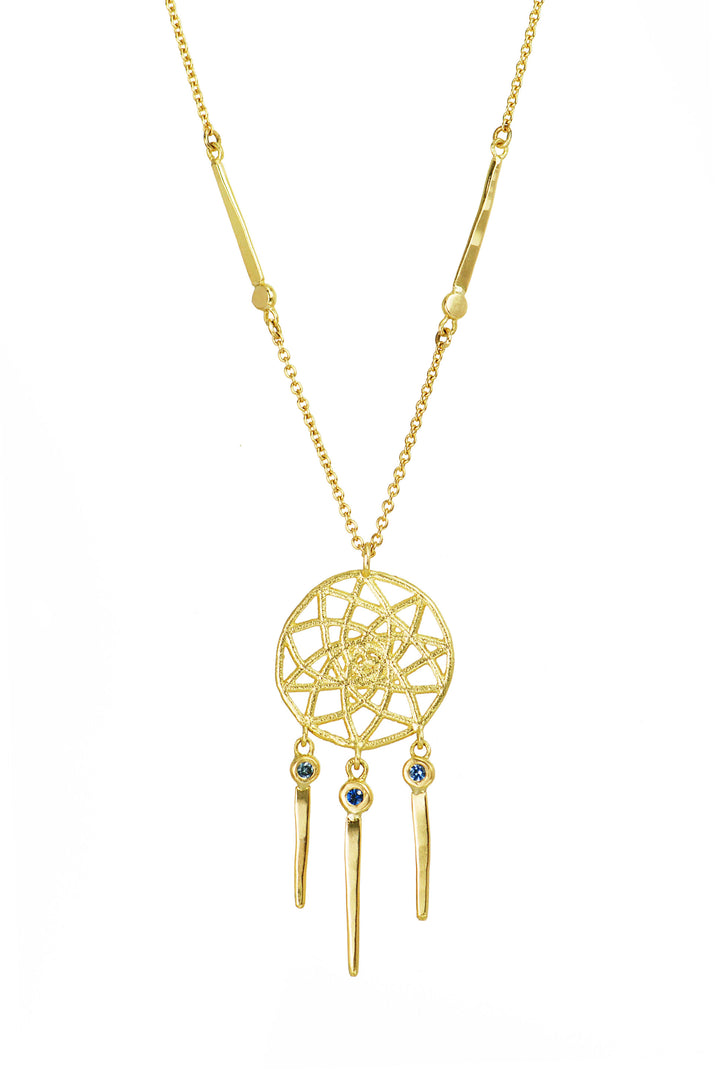 18k recycled gold pendant with sapphires on 18k gold chain.Dimensions: Approx. 4cm pendant on 20 inches chain.