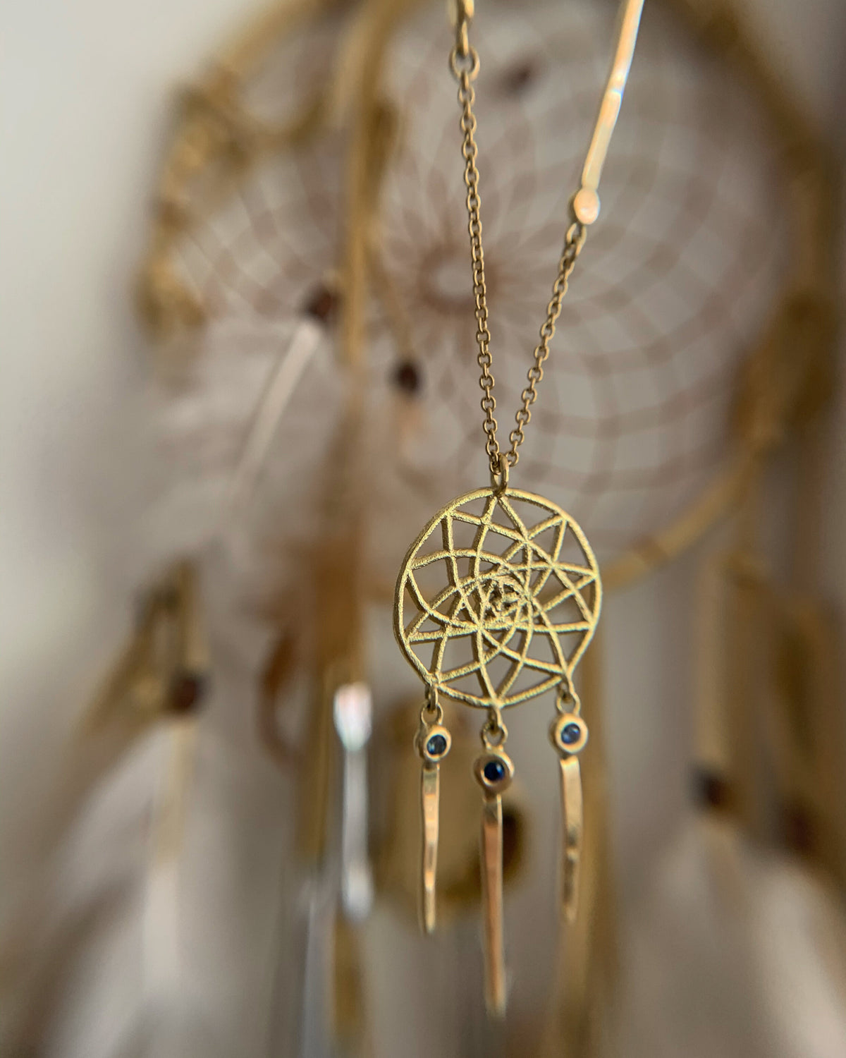 From Claire's Dreamcatcher collection. The dreamcatcher is a Native American protective talisman used to keep away nightmares and bad dreams; they get caught in the web and destroyed in the morning sunlight, while the good dreams filter gently through.