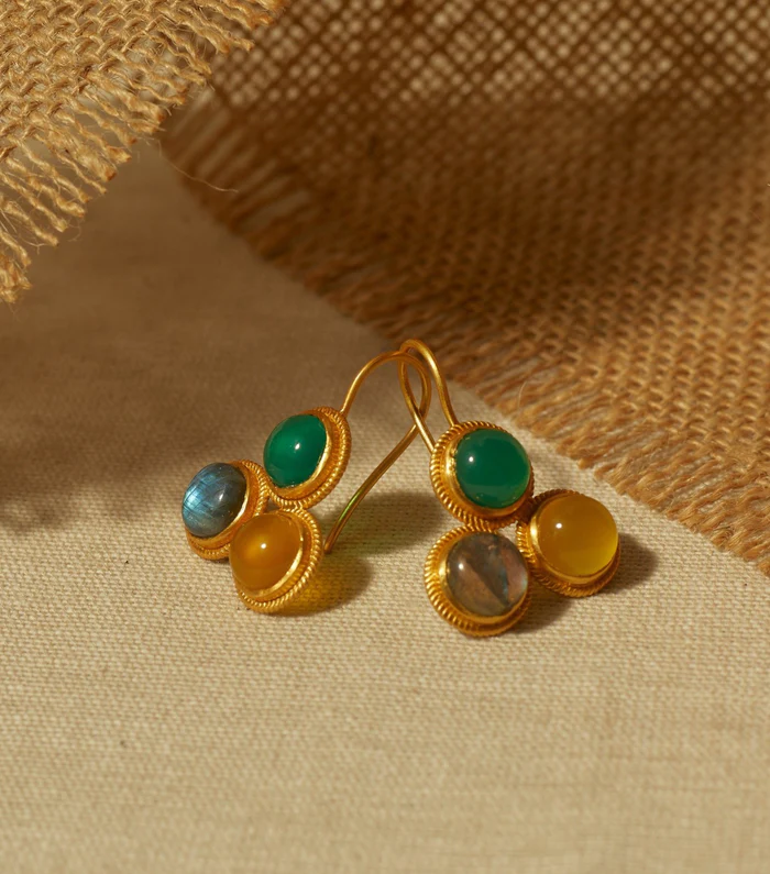 This delicate color stones Jaipur Tres Earrings features a trio of cabochon-cut yellow onyx, labradorite and green onyx, set on a 18k gold sterling silver collet with a twist motif. The ethically sourced stones contrast perfectly against the matte-finish setting, giving a vintage-heritage look to this piece. Perfect for matching them with the petite stacking rings or one of the Jaipur necklaces.
