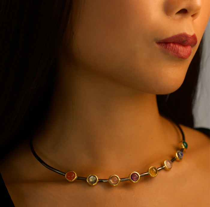 This contemporary and eye-catching choker nods to the aesthetic simplicity of The Orient. Its colorful sequence of cabochon-cut gemstones is framed by gold-plated collet and set on a matte black rhodium-finish sterling silver. This is an iconic piece of the Saigon collection and ideal for day or night.