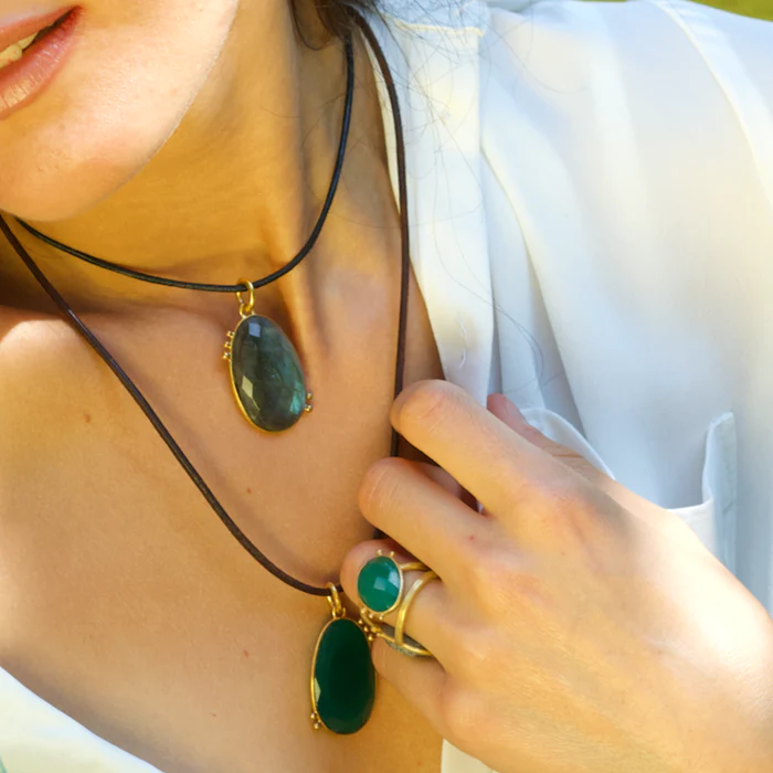 Inspired by the rich vegetation and earthy hues of the Amazon rainforest, this handmade pendant features a large, cabochon-cut, labradorite gemstone. Displayed in an 18ct gold on sterling silver setting, note the unique asymmetric gold prongs and matte metal finish. Adjust the leather cord to a variety of lengths and style it your way.