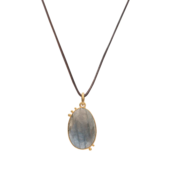 18k gold on sterling silver with labradorite.Dimensions: Approx. stone size: 3cm. 41cm adjustable leather chain.