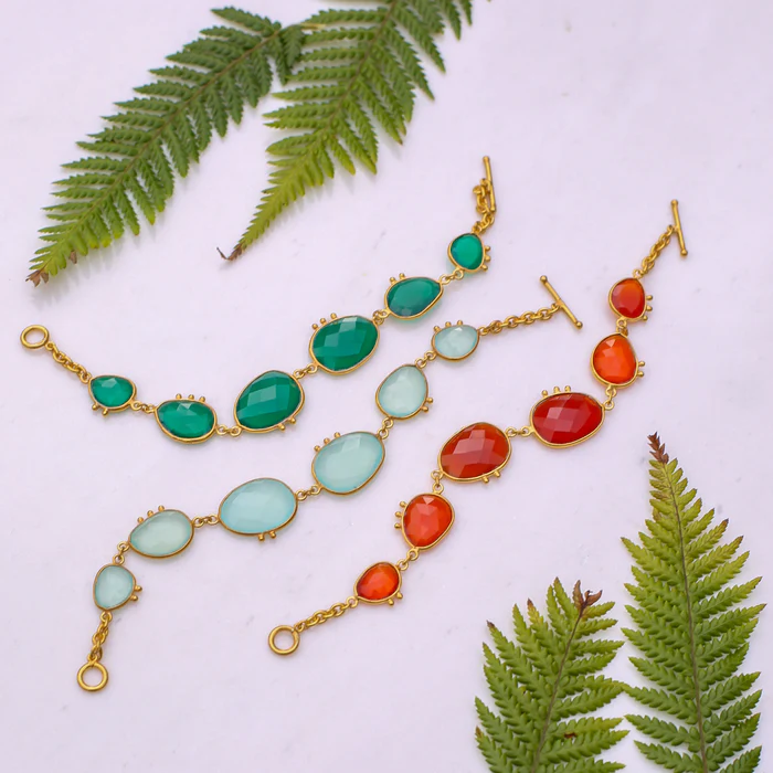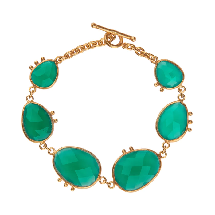 Beautifully handmade from 18ct gold plating on sterling silver, this vibrant semi-precious, gemstone bracelet is inspired by the beauty of the Amazon rainforest. Evocative of such an organic and earthy setting, the piece boasts six green onyx stones in a matte gold setting, completed with nature-inspired asymmetric gold prongs on both sides of each gemstone. To retain the natural beauty of the stone, each gem has been individually unevenly hand-cut, making each piece unique.