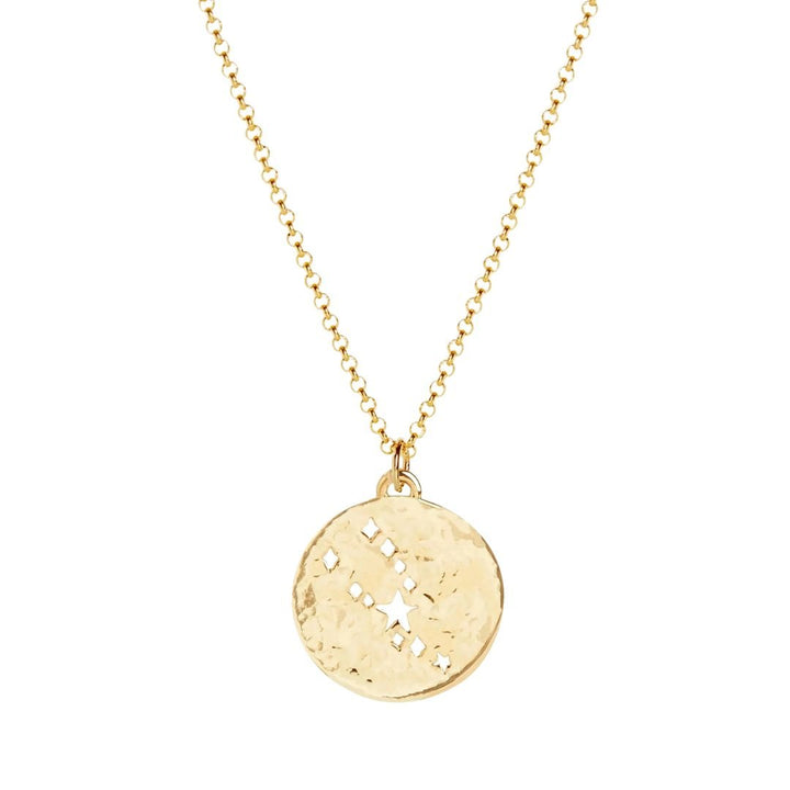 Muru Jewellery, founded by Marie and Phil in 2006, is a brand rooted in their passion for travel and the creation of lasting memories. Muru's signature style embraces minimalist simplicity, allowing wearers to mix and match for a personalised jewelry statement that reflects their style. Every piece is imbued with special meaning, inspiring the wearer on a daily basis. The iconic talismanic necklaces are interchangeable, collectible, and available in various chain lengths, offering endless layering possibilities.Style notes: Celebrate your unique star sign with Muru's delicate constellation necklace. This silver Taurus pendant features a detailed cut-out pattern that represents the Taurus Constellation of stars. Taurus's are known for being patient, loyal and down to earth. Embrace your inner Taurus with this zodiac necklace design with a unique hammered finish.Price: Please note price may vary due to exchange rate differences or shipping, duties and taxes. Final price is calculated at checkout at the designer's website.Materials: 18k Gold-plated vermeil on sterling silver. Choose between plain belcher chain or bead chain.Dimensions: Pendant diameter 16mm. Chain length 18', 20', 26' or 16'.