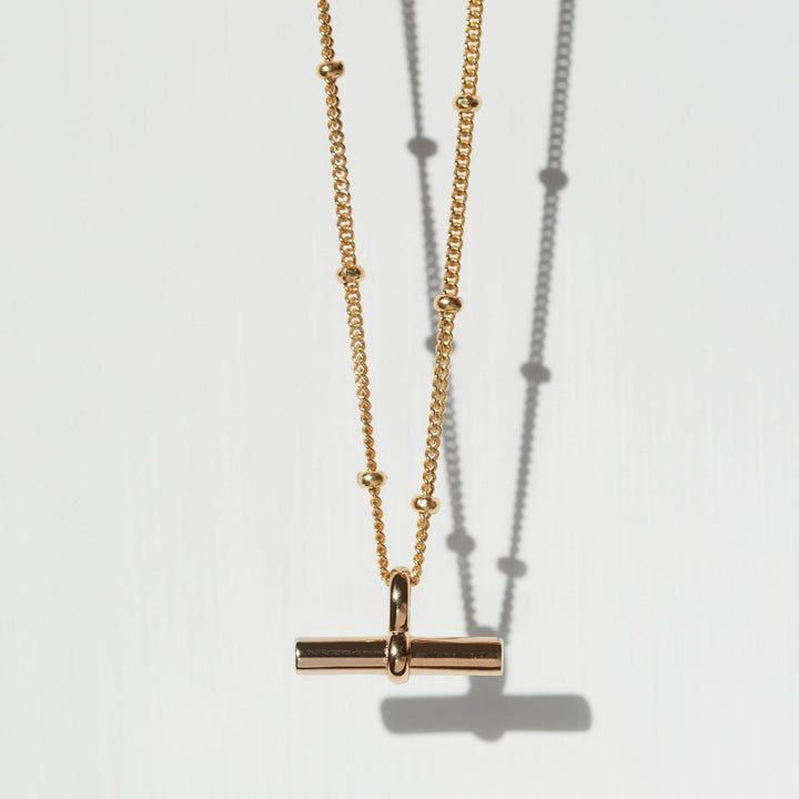 Handcrafted in 18-karat gold vermeil. Features a T-bar pendant on a 16-inch bead chain, designed to promote balance and peace in your daily life.
