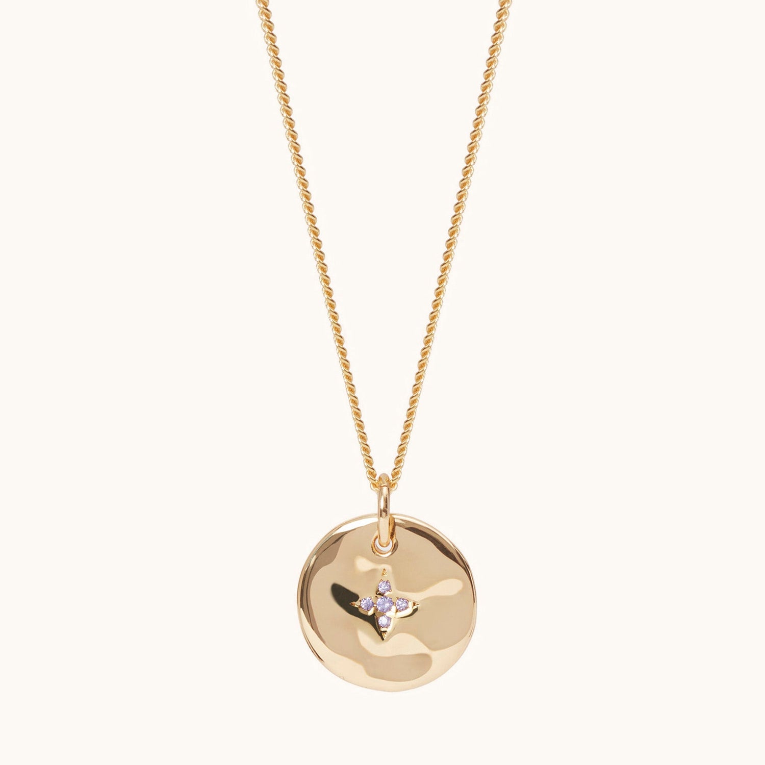 Handcrafted in 18ct gold vermeil with a 16'' curb chain. Features a polished finish and an amethyst stone as the birthstone centerpiece.
