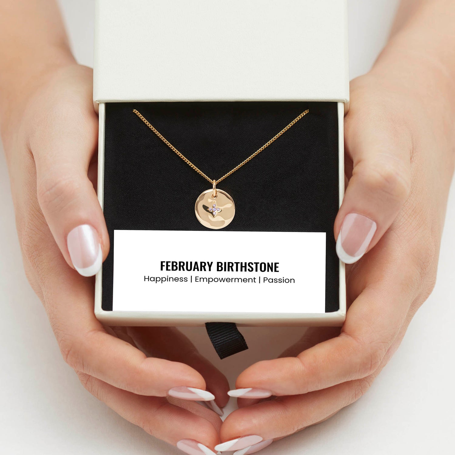 These February Birthstone Necklaces by Muru Jewellery are designed to inspire creativity and calm. Featuring the amethyst, a stone known for its protective and healing qualities, this necklace is both elegant and meaningful. Perfect for layering or wearing as a standout piece, it adds a touch of sophistication to any look.