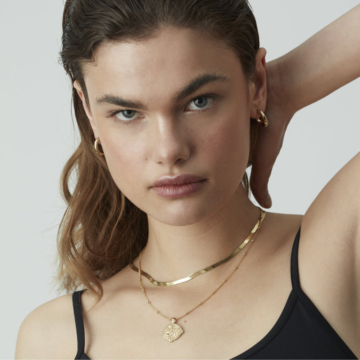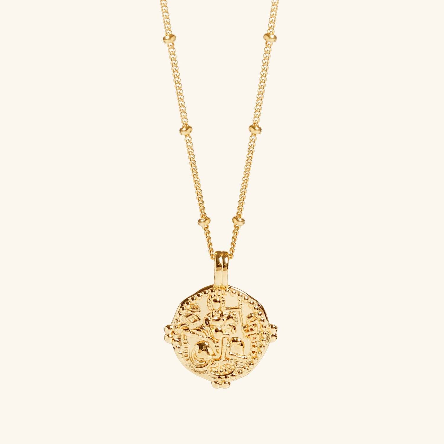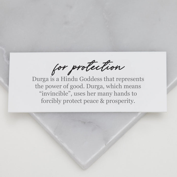 This Durga Coin Necklace With Bead Chain by Muru Jewellery features the cherished Hindu goddess Durga, a symbol of protection, strength, and justice. This piece is perfect for those who seek empowerment through timeless symbolism.