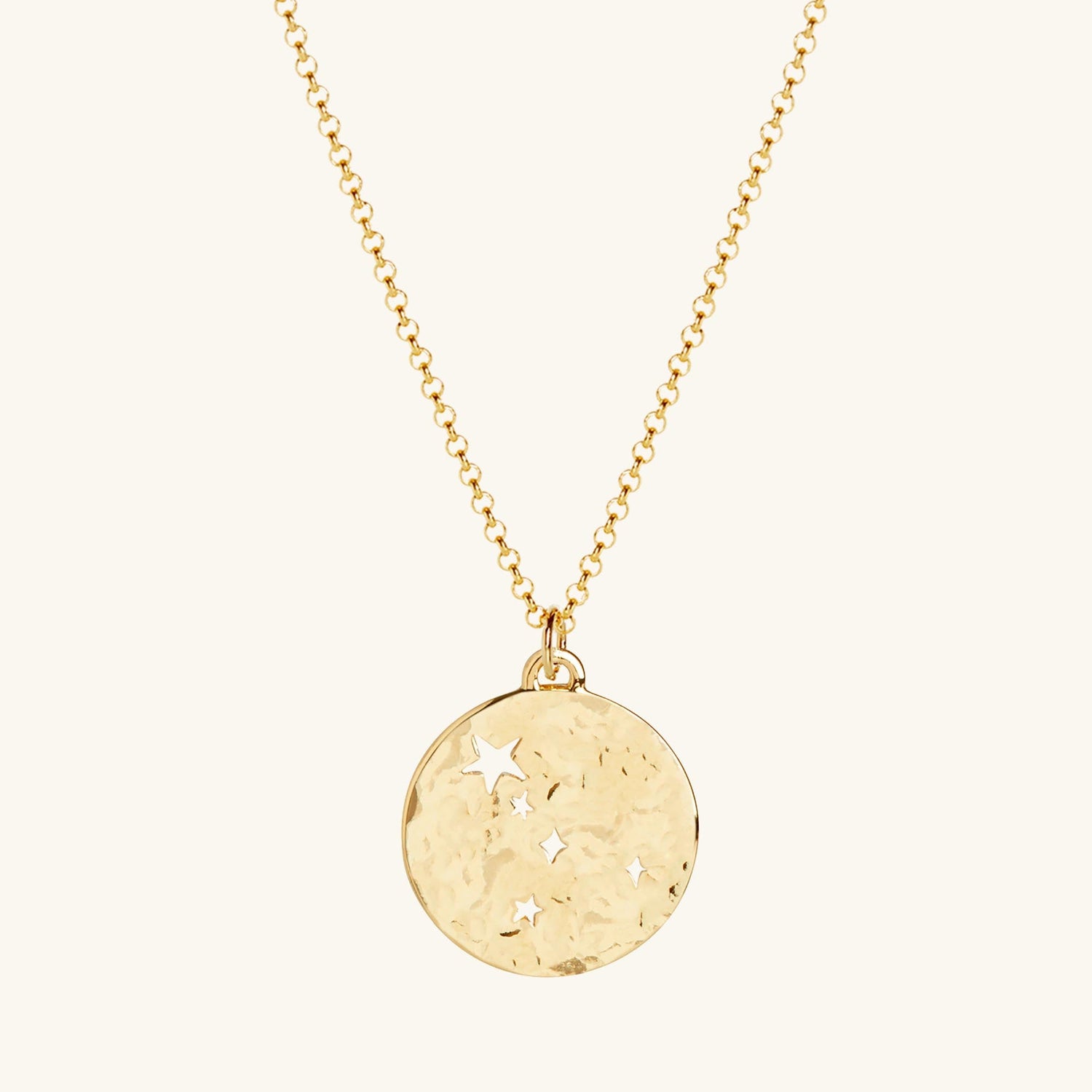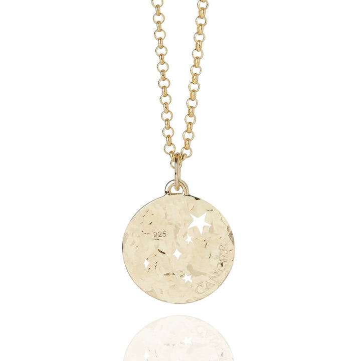 This Cancer Zodiac Necklace Hammered Gold by Muru Jewellery is designed for the intuitive and caring Cancer star sign. Its unique star pattern and lightly hammered finish make it a sentimental and luxurious gift.