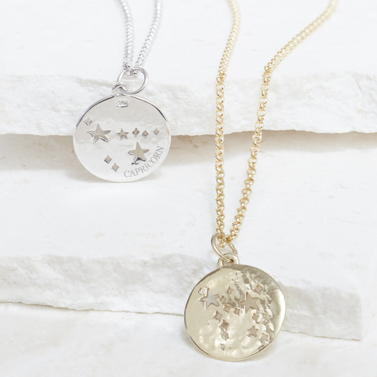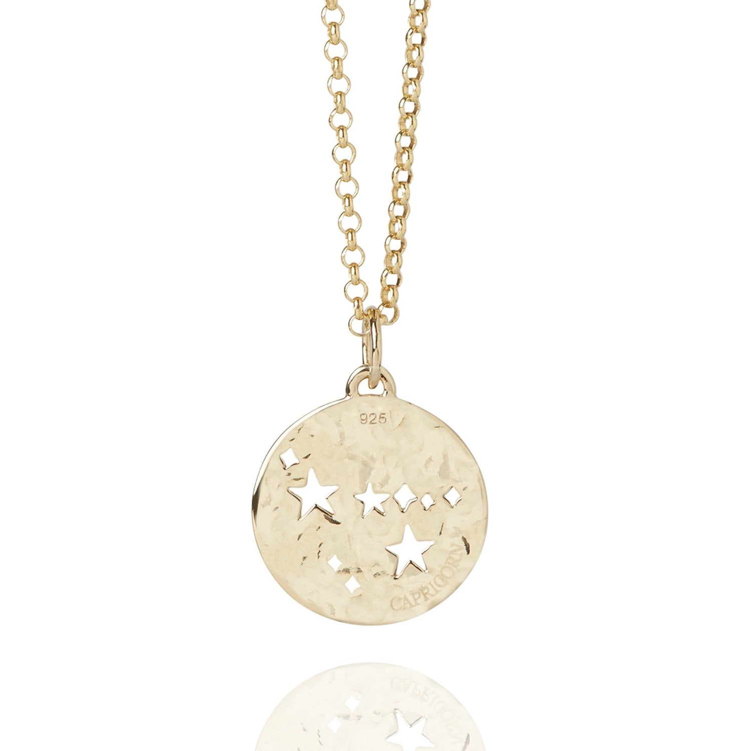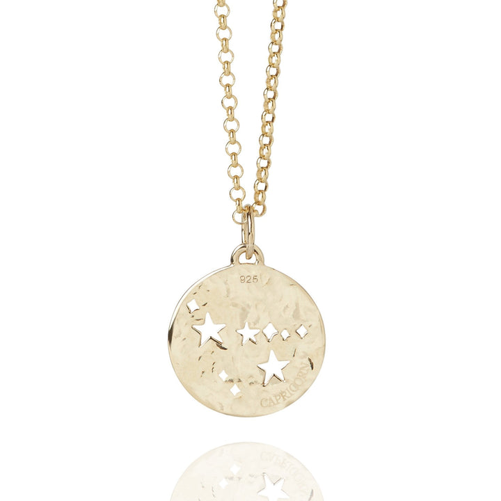 This Capricorn Zodiac Necklace Hammered Gold by Muru Jewellery embodies the ambitious and disciplined Capricorn star sign. Featuring a unique cut-out constellation design and a lightly hammered finish, it is a celestial addition to any collection.