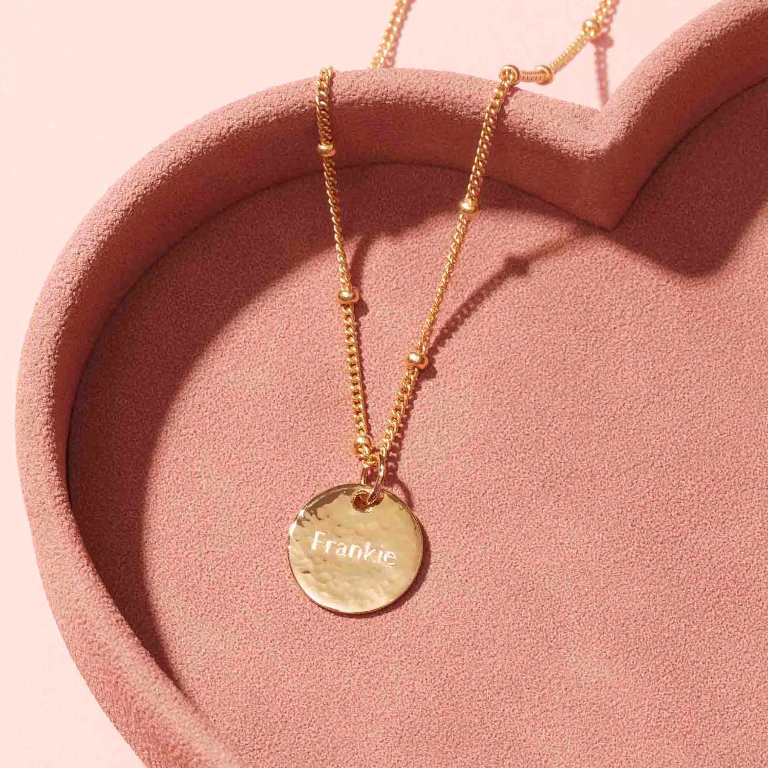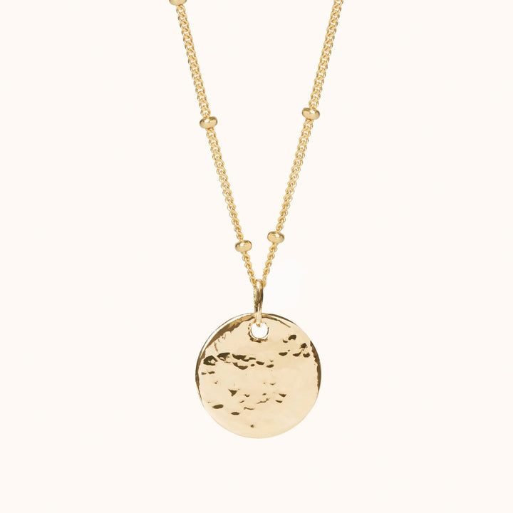 These Gold Hammered Necklaces by Muru Jewellery are timeless pieces featuring a lightly hammered texture. Designed to be personalized, they make thoughtful gifts or treasured keepsakes for your collection. The elegant bead chain adds a refined touch, perfect for everyday wear or special occasions.