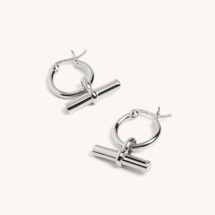 Handcrafted in sterling silver. Hoop diameter: 2.5 cm, T-bar dimensions: 1 cm x 1 cm.