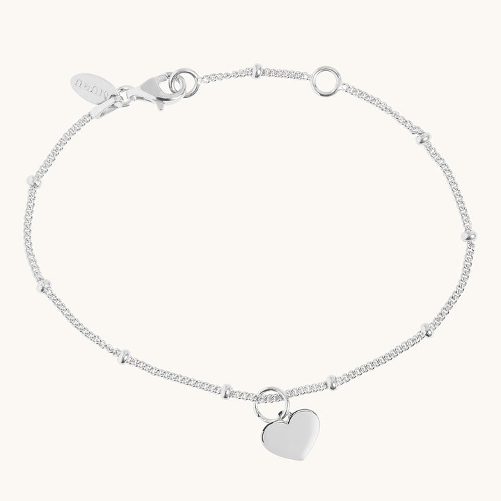 The Heart Bracelet in Silver by Muru Jewellery is a delicate sterling silver piece featuring an initial heart charm that can be personalized with your choice of initial. This elegant bracelet makes a perfect gift or a special addition to your jewelry stack.