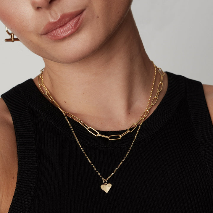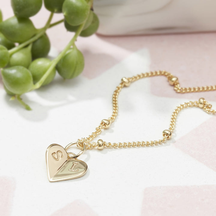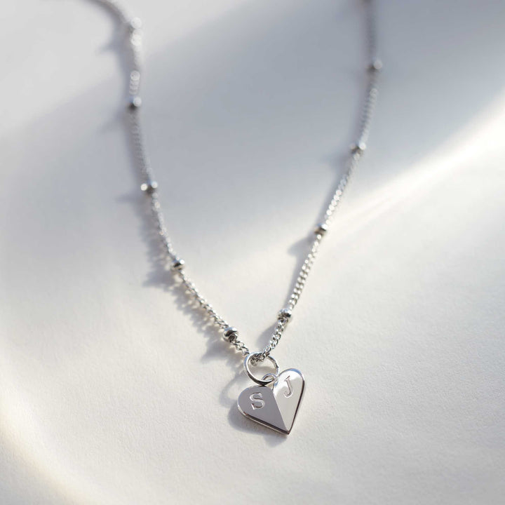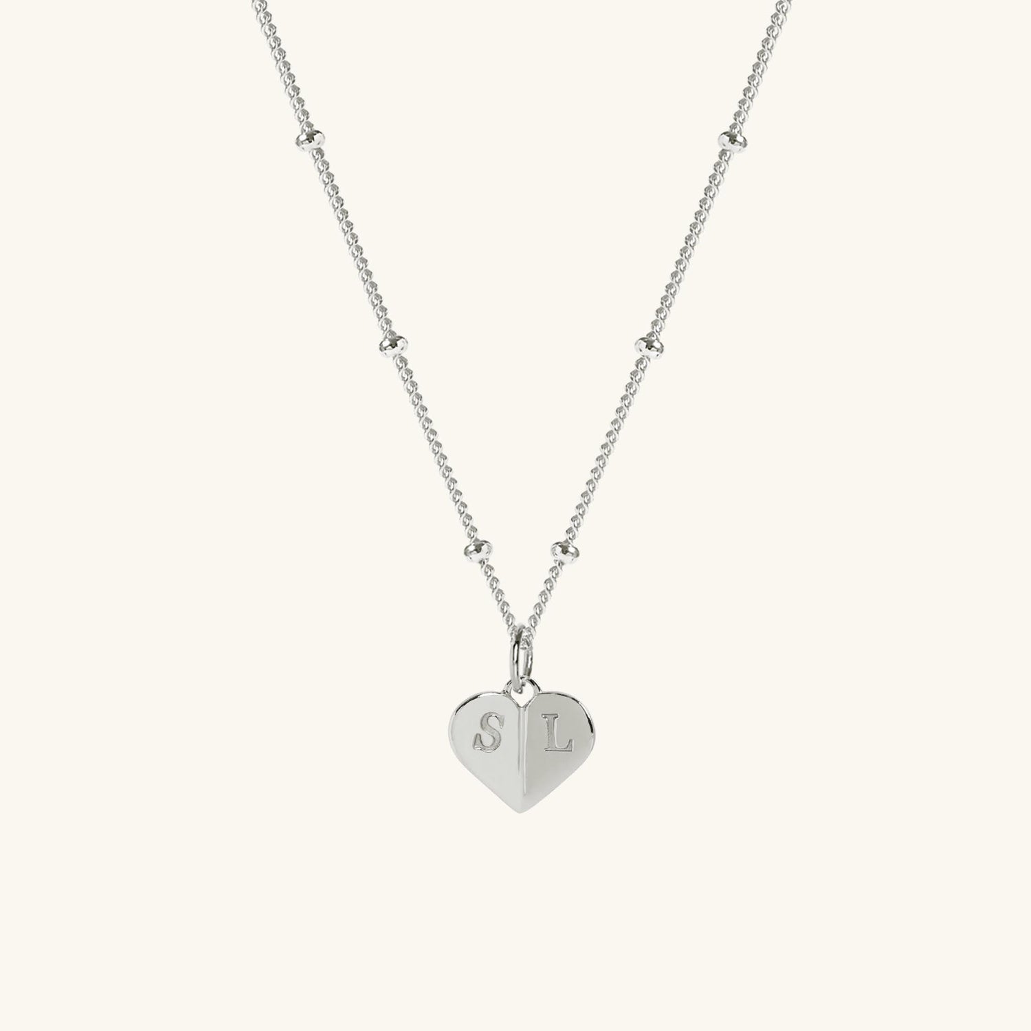 Mini Heart Necklace in Silver With Bead Chain by Muru Jewellery celebrates love. This contemporary folded heart pendant on a delicate bead chain can be personalized with two hand-stamped initials, making it a meaningful gift for yourself or someone special.