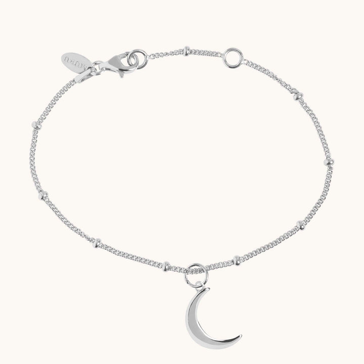 Crafted from solid sterling silver, featuring a crescent moon charm and beaded chain. Adjustable clasp for a secure fit.