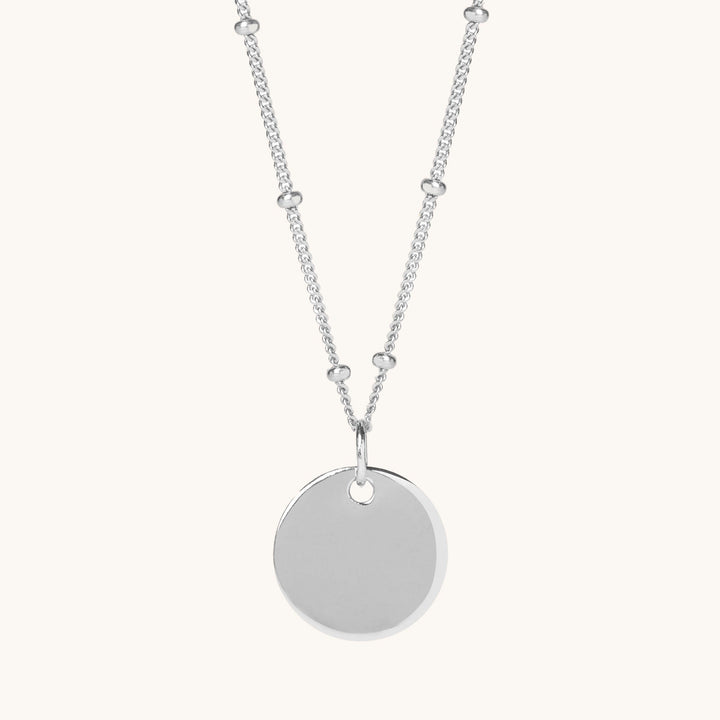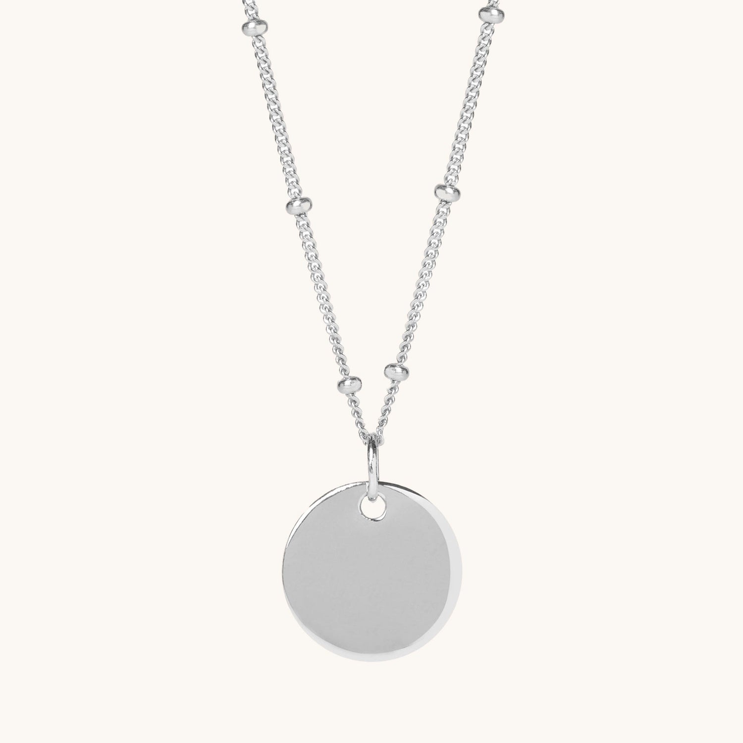 Handcrafted in sterling silver. Round disc pendant measures 15mm in diameter, suspended on a 16-inch bead chain.