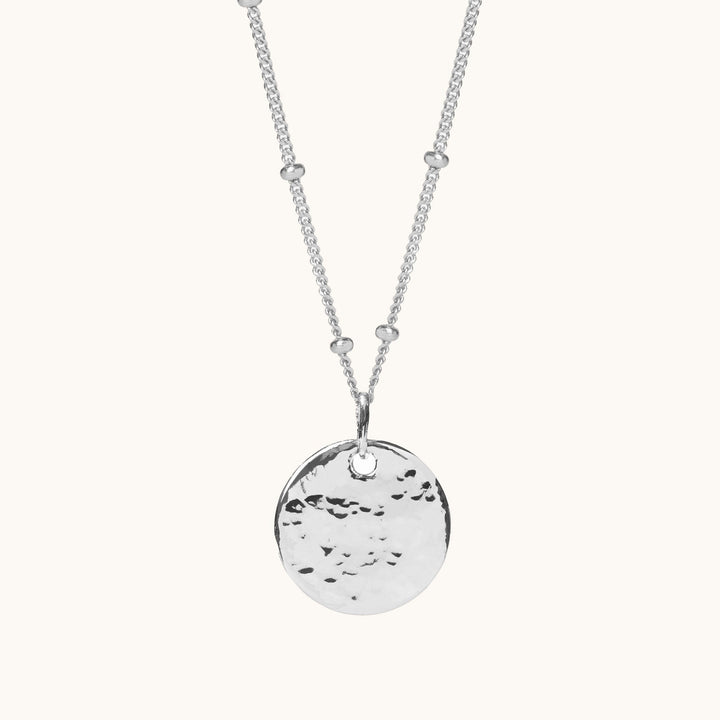 Crafted in sterling silver with a lightly hammered texture. Disc pendant measures 18mm in diameter, suspended on a 16-inch bead chain.