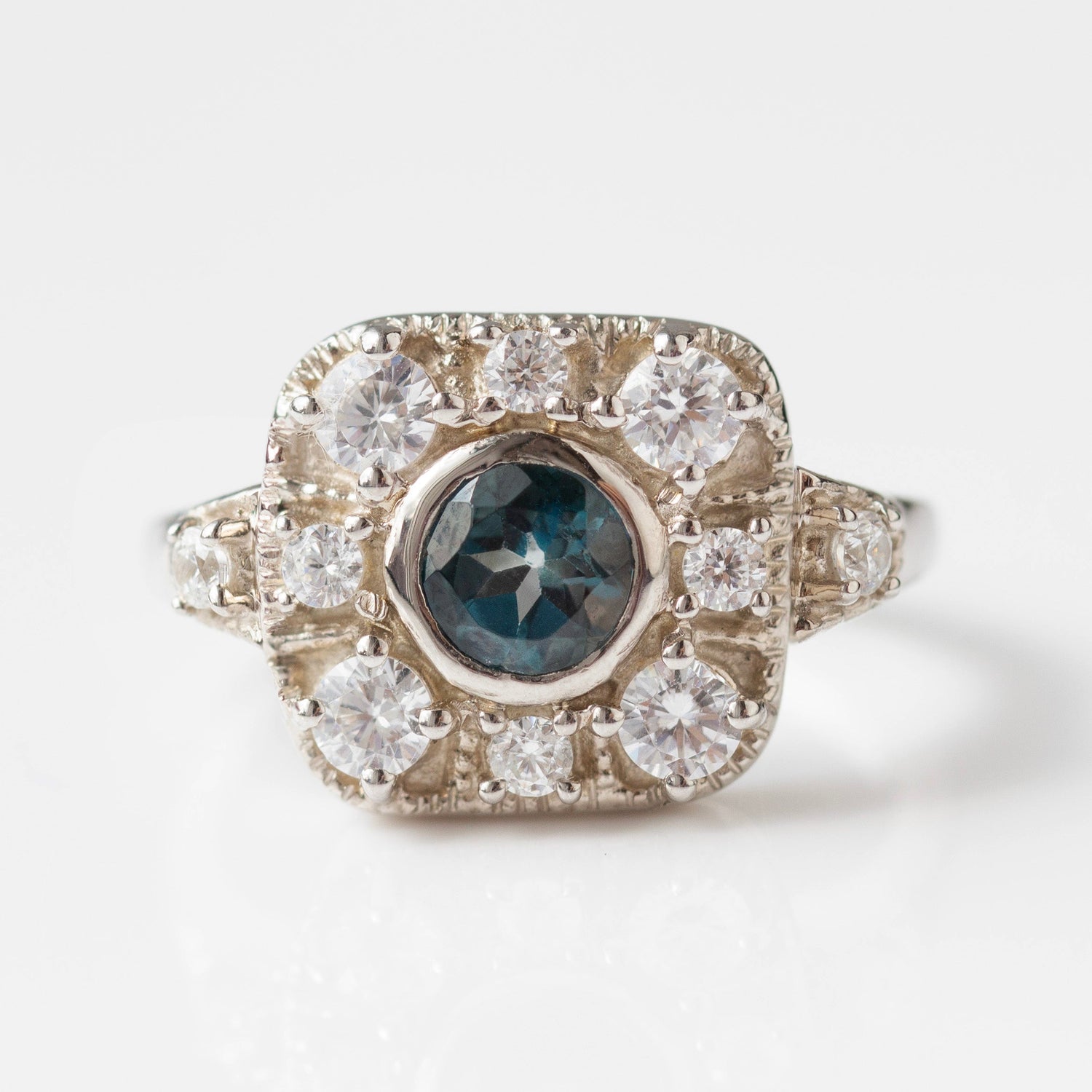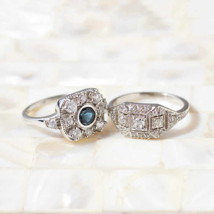 This Angelica Blue Topaz Vintage Ring by Carrie Elizabeth captures vintage elegance with its dazzling deco design. The London blue topaz center stone symbolizes clarity, honesty, and emotional healing, making it both a meaningful and stylish piece.