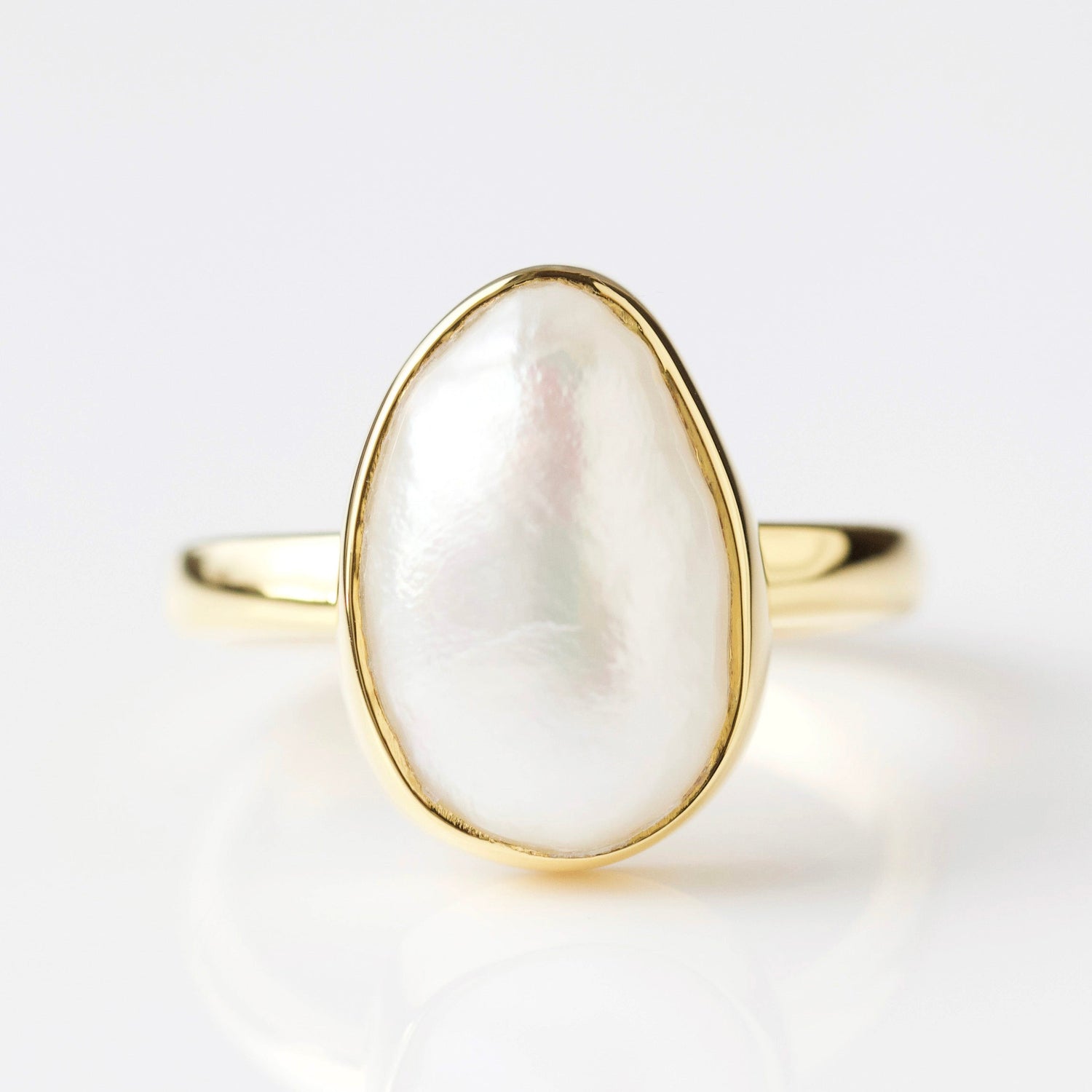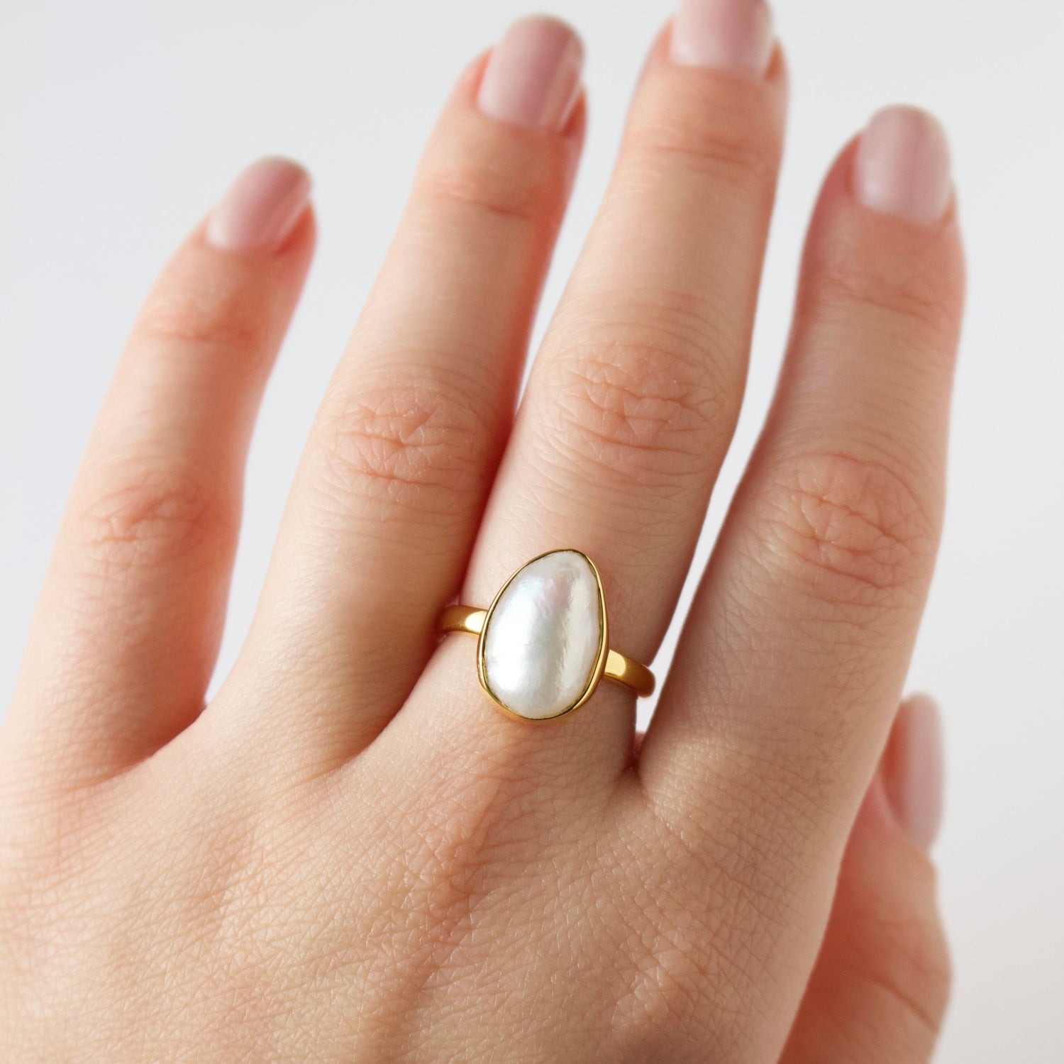 This Baroque Pearl Ring by Carrie Elizabeth (14k Gold Vermeil) is a true statement piece. Featuring an organic baroque pearl that shimmers with an iridescent glow, each ring is uniquely one of a kind. Pearls are believed to symbolize prosperity, luck, and abundance, making this ring both beautiful and meaningful.
