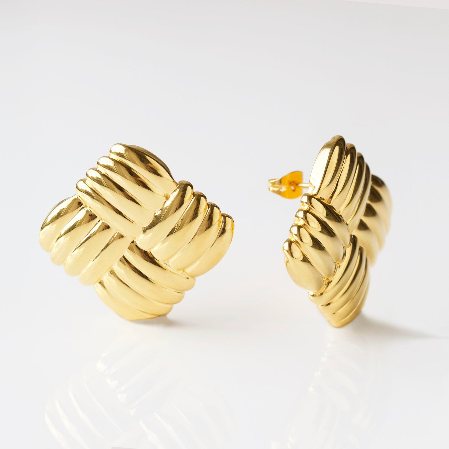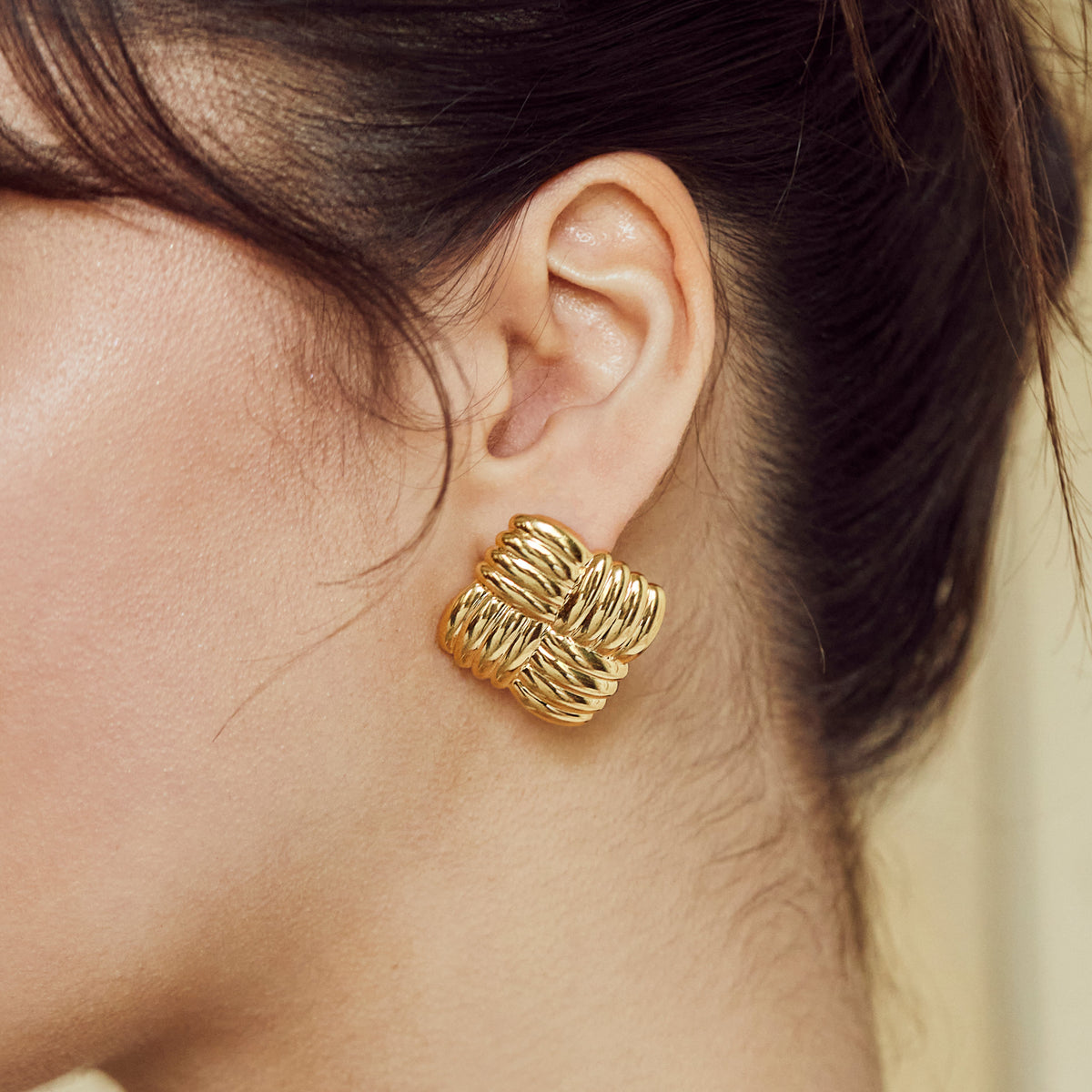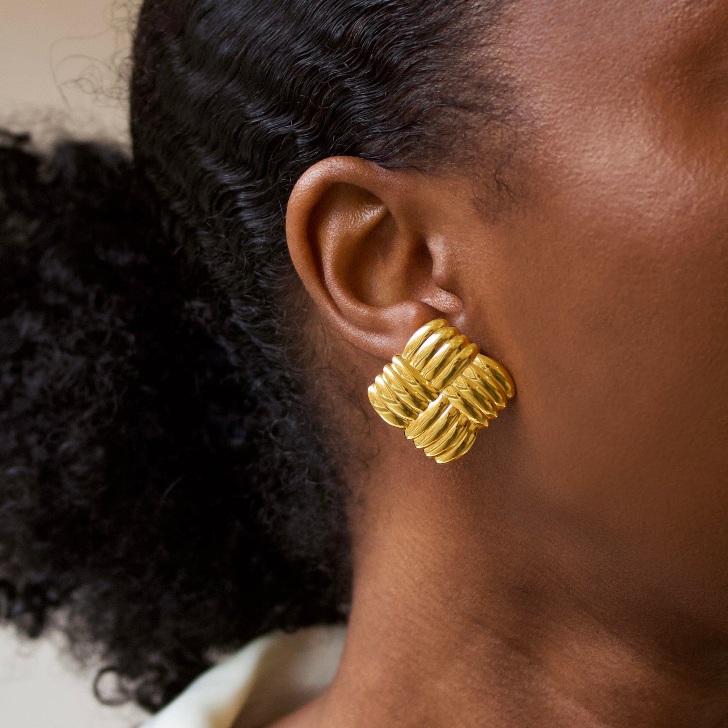 These Basket Weave Statement Stud Earrings by Carrie Elizabeth are the ultimate in bold, contemporary style. Featuring an oversized basket weave design, these studs are perfect for transitioning seamlessly from day to night. A must-have for the season, they add a touch of drama to any look.