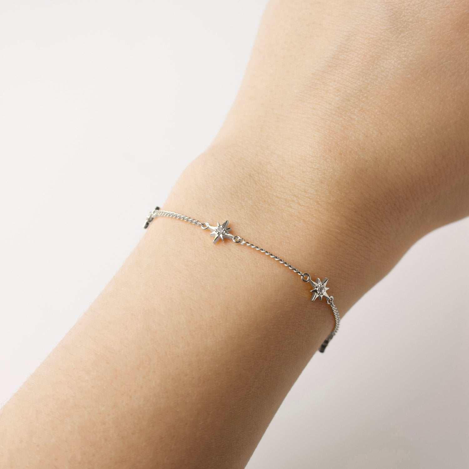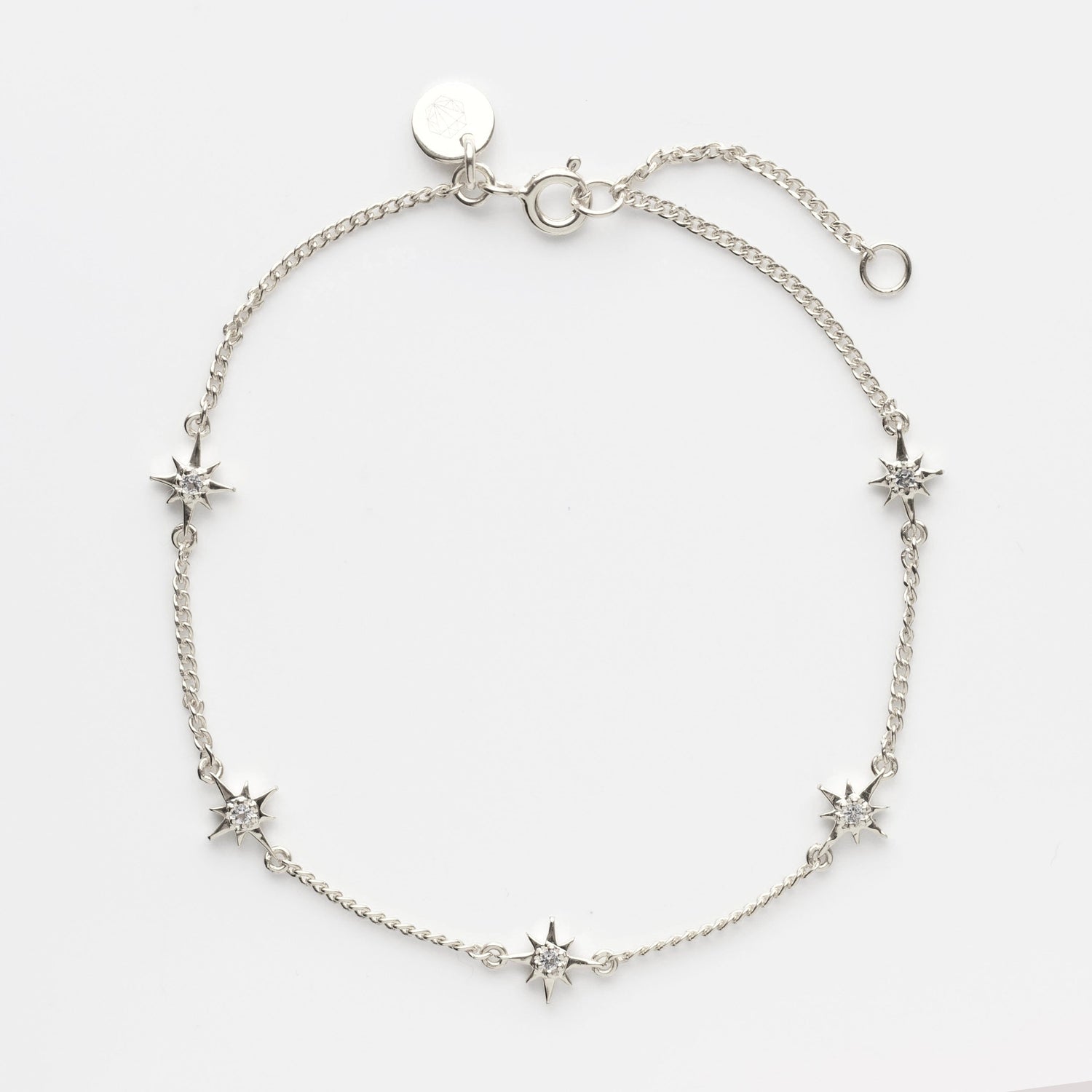 This Celestial Dainty White Topaz Star Bracelet by Carrie Elizabeth (Sterling Silver) mirrors the gold vermeil version, offering a sleek silver finish for a modern celestial look. The dainty star chain sparkles with white topaz stones, perfect for layering or as a standalone piece.