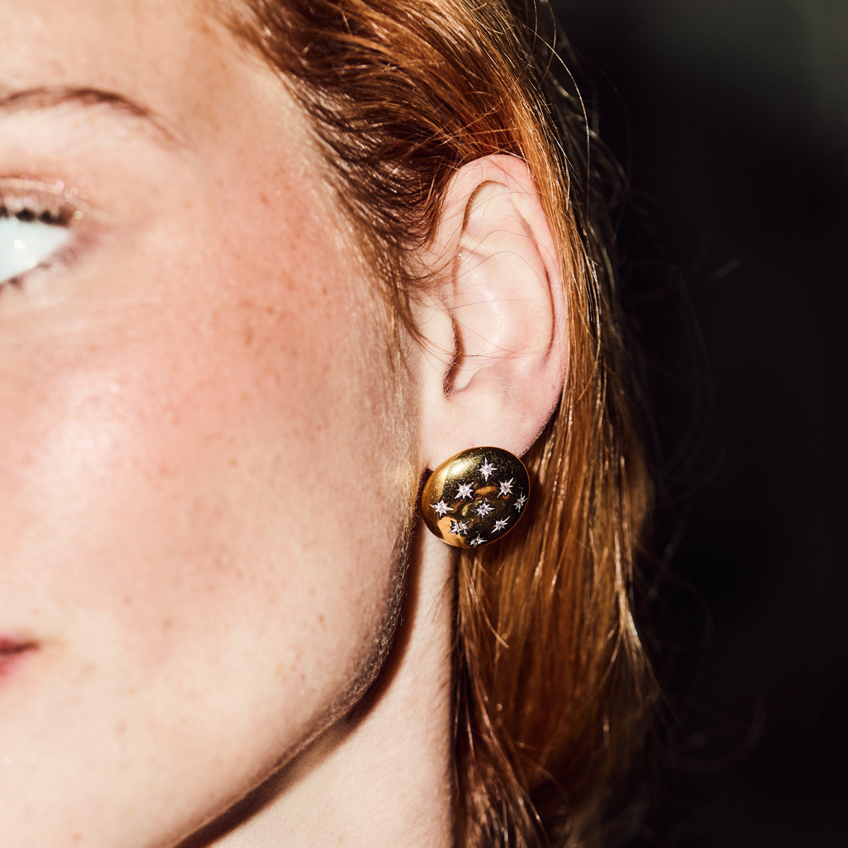 These Celestial Dome Stud Earrings by Carrie Elizabeth elevate your style with vintage-inspired charm. Featuring star-set white zircon stones, these dome-shaped studs add subtle sparkle to your everyday look. Zircon is believed to enhance mental clarity and spiritual growth, making these earrings as meaningful as they are beautiful.