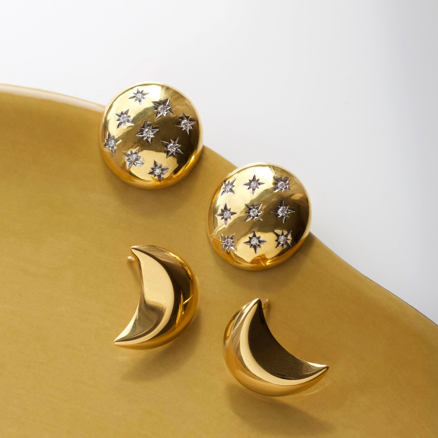 Gold-plated metal with white zircon stones in a star-set design. Dome shape for a classic yet unique aesthetic.