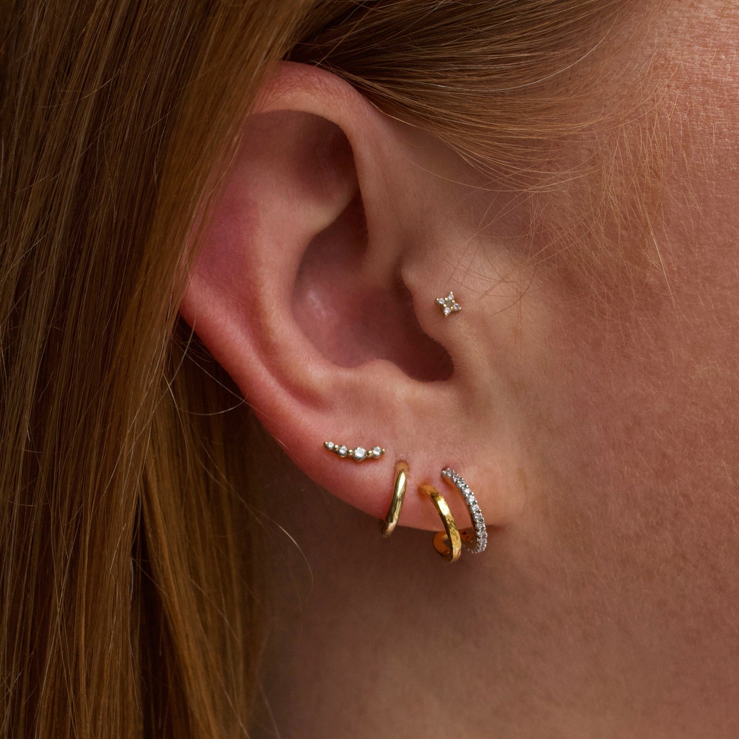 These Celestial Pave Double Hoops by Carrie Elizabeth (14k Gold Vermeil) are a sparkling addition to your ear stack. Designed with cubic zirconia stones, these double hoops create the illusion of two hoops in one piercing, combining simplicity with elegance. Ideal for adding a touch of celestial glamour to any look.