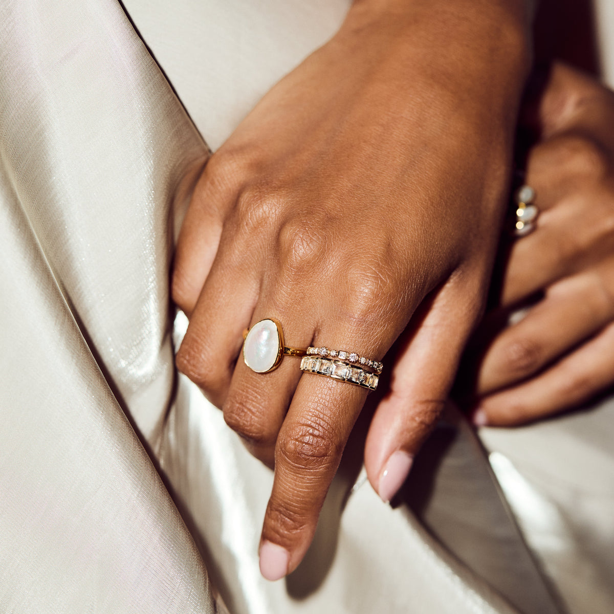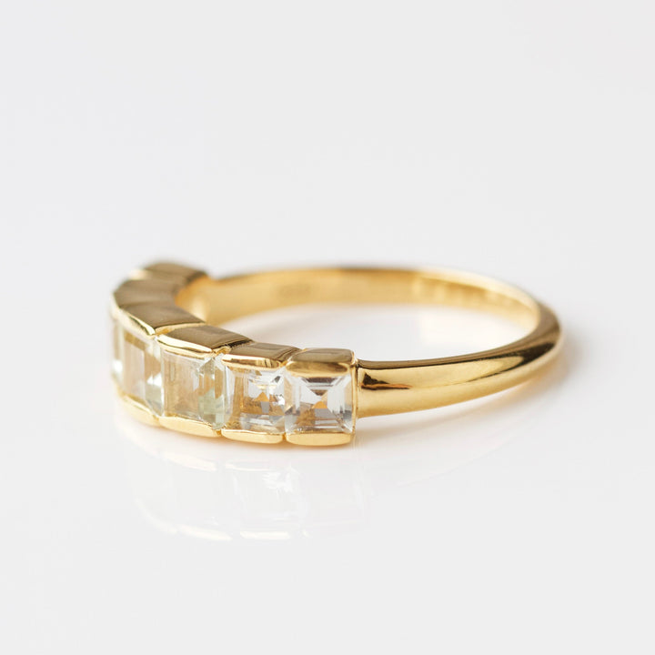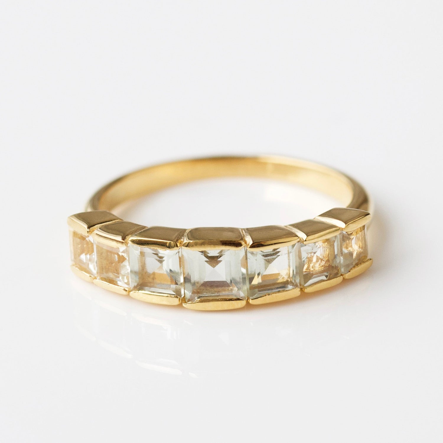 This Charlotte Green Amethyst Ring by Carrie Elizabeth (14k Gold Vermeil) brings a subtle yet captivating sparkle to your jewelry collection. The graduated green amethyst stones symbolize clarity and compassion, inspiring self-acceptance and love. Perfect for stacking with other rings, this piece adds a refined touch to any ensemble.